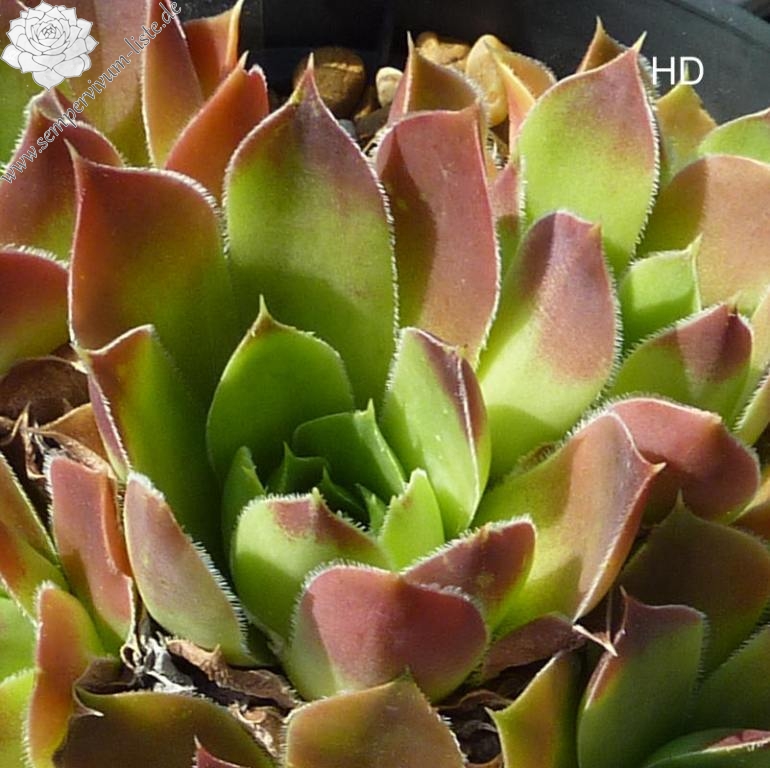 Rosetten bis 6 cm, Zentrum hellgrün, Blattspitzen rosa-braun, Blattränder hell bewimpert