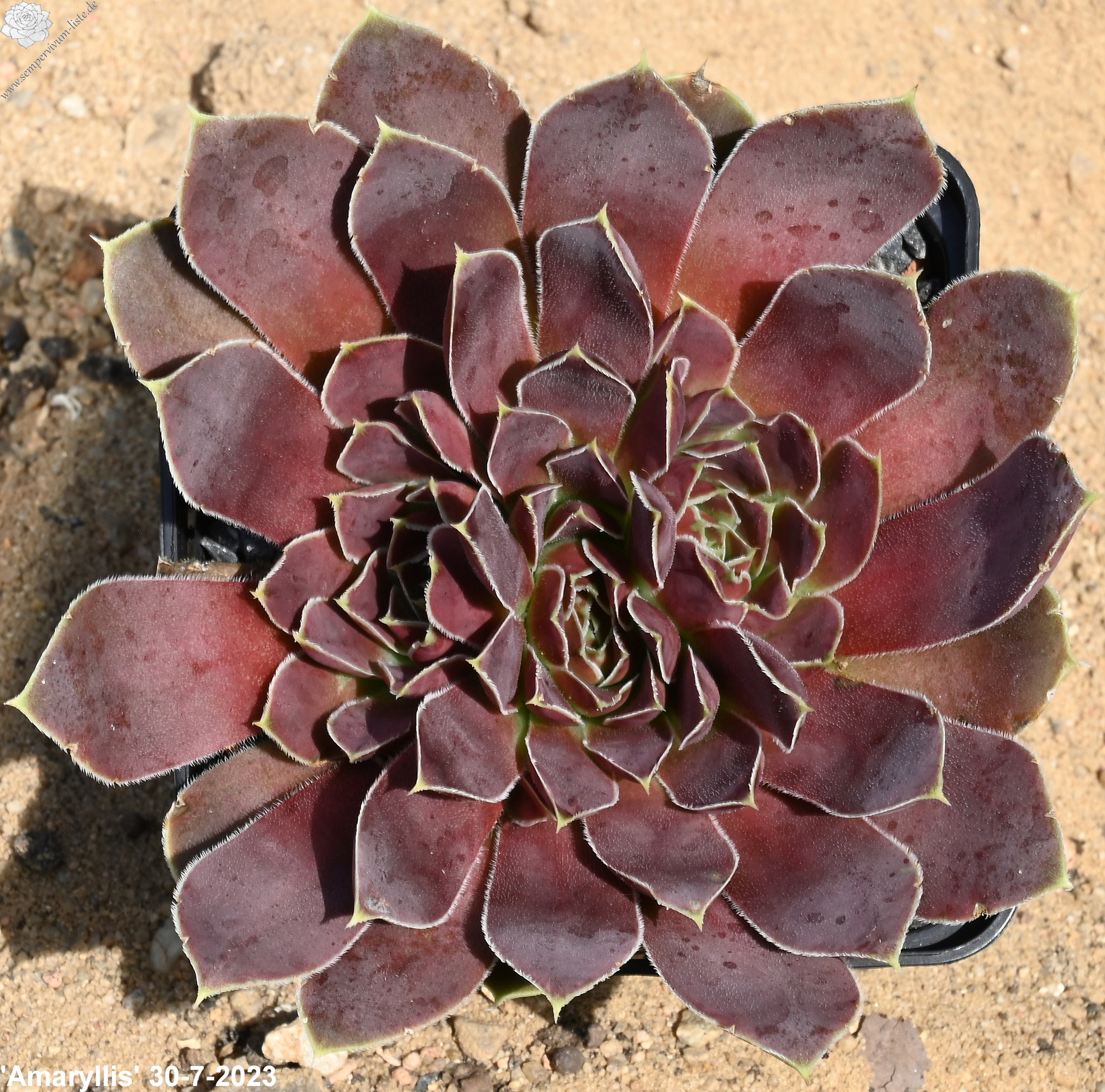 Rosetten bis 6 cm, Blätter rundlich, lang bespitzt, samtige Substanz, Mischfarben gelblich - altrosa, Blattränder gelblich, leicht bewimpert