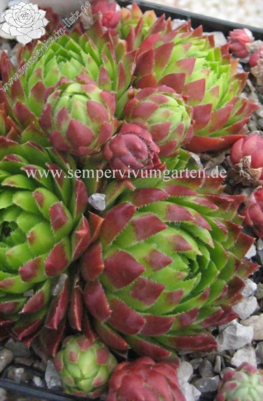 Ein igeliger Kultivar mit frischgrünen Rosetten aus Belgien. Zum Herbst orange-rötliche Töne der Blattspitzen und der Blattunterseite.