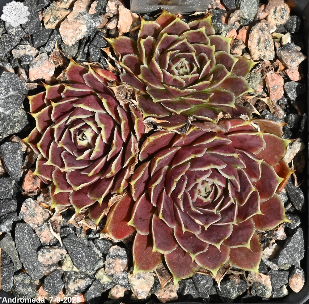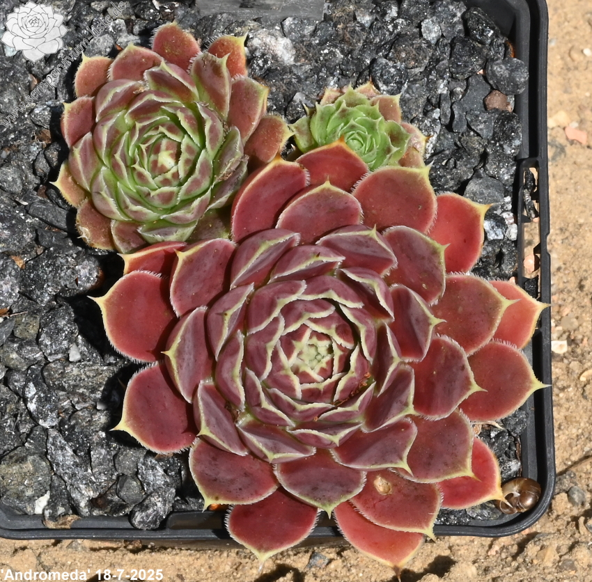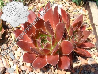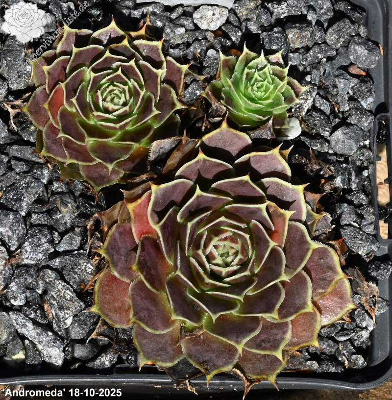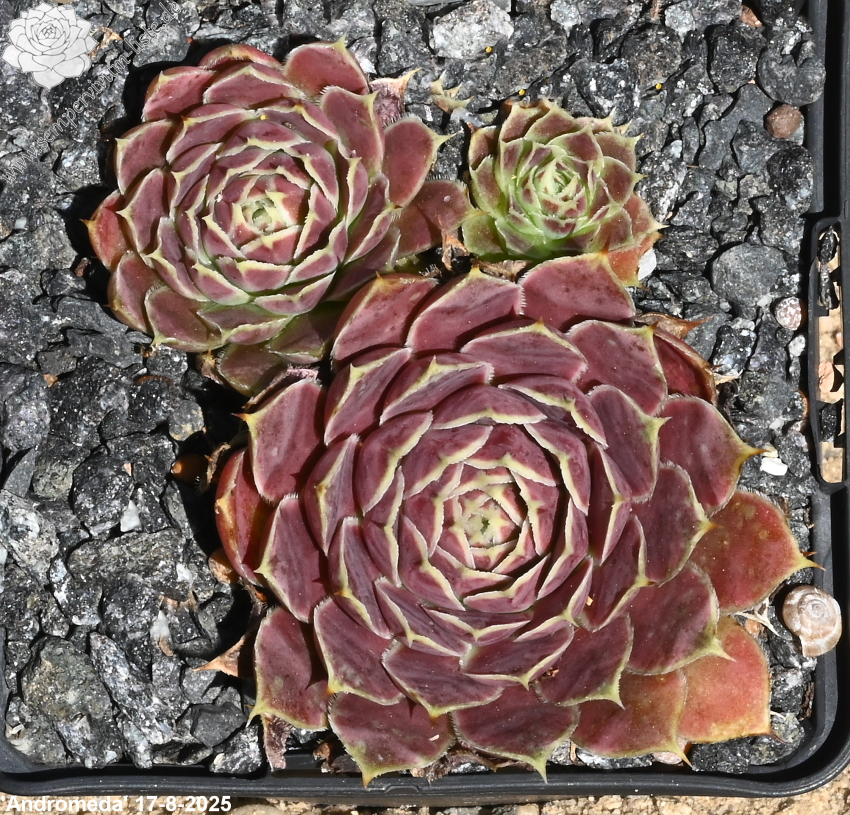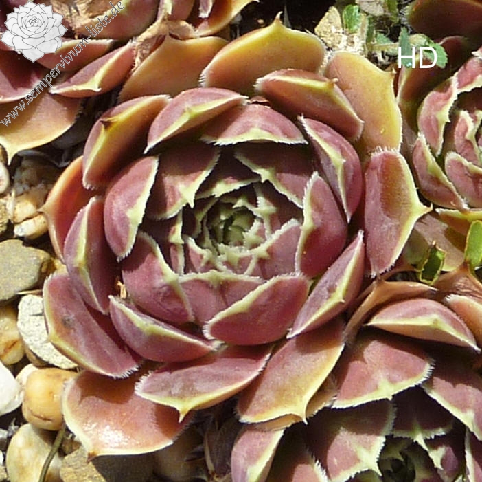 ein Elternteil: S. heuffelii 'Bronze Ingot', Rosetten bis 8 cm, Blätter länglich, spitz zulaufend, Basis grünlich in rotbraun übergehend, Blattränder bewimpert