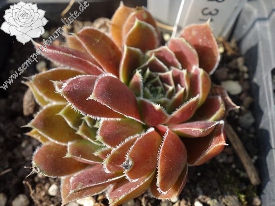 kleine Rosetten, Blätter rundlich, kurz bespitzt, trübes Lila, Blattränder hell, bewimpert