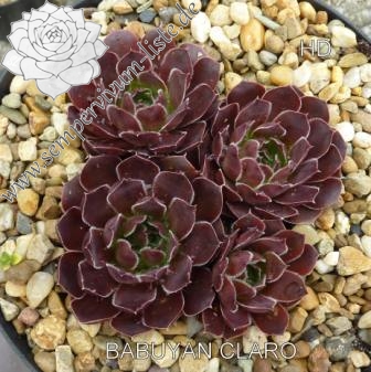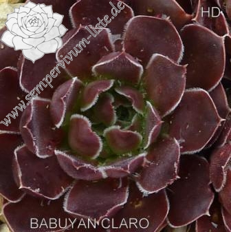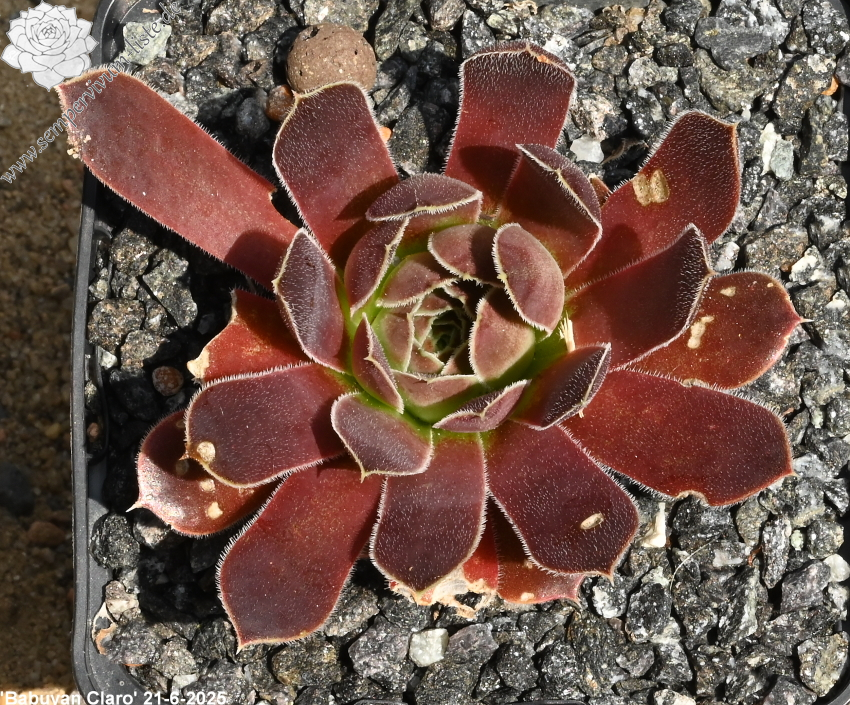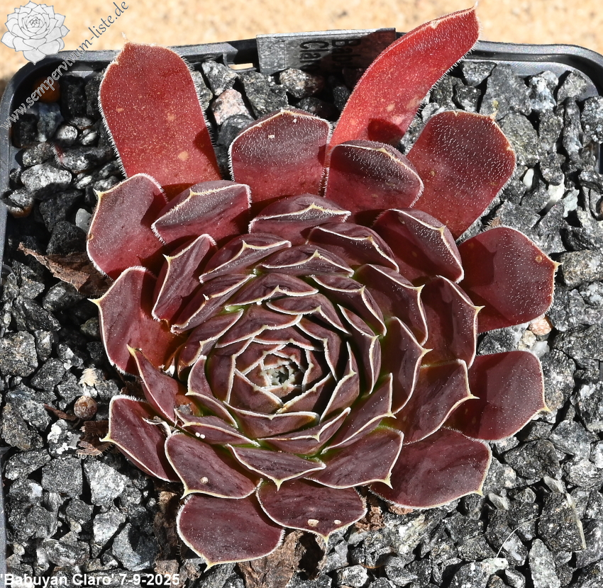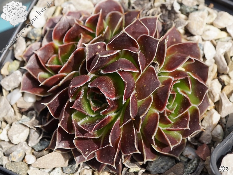 Rosetten bis 7 cm, Blätter keilförmig, kurz bespitzt, dunkles Braunrot, Ränder silbrig bewimpert