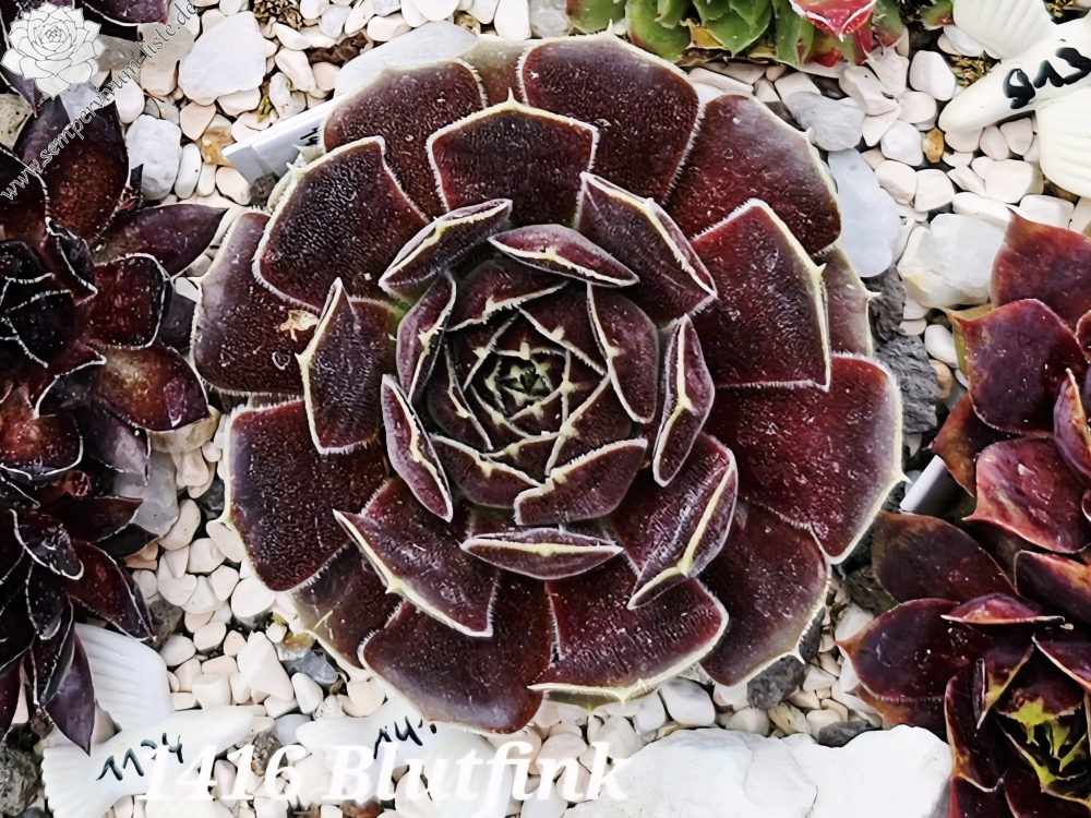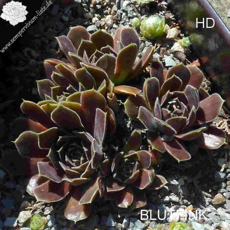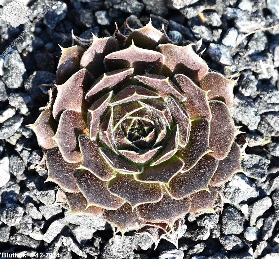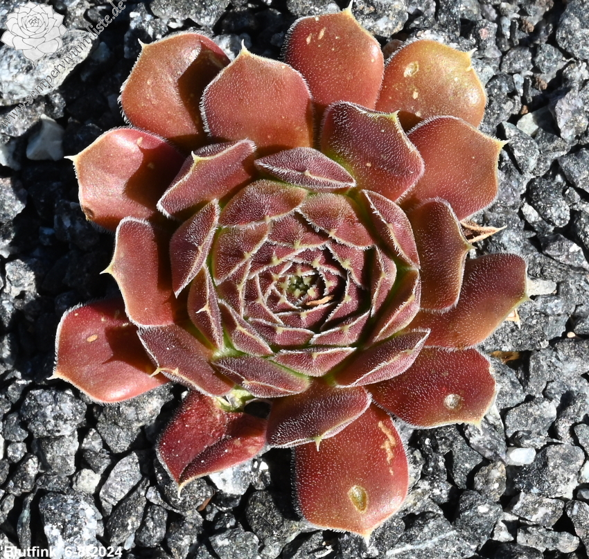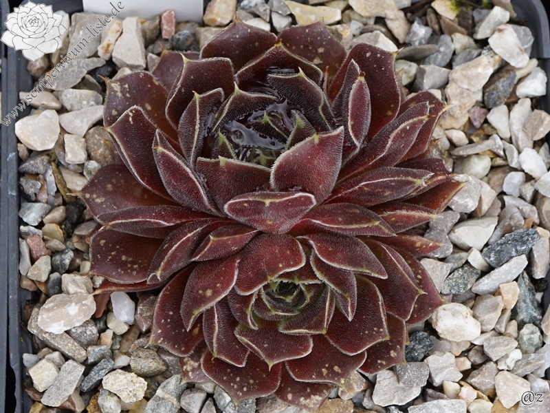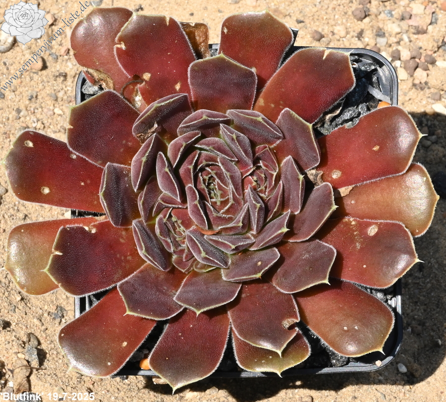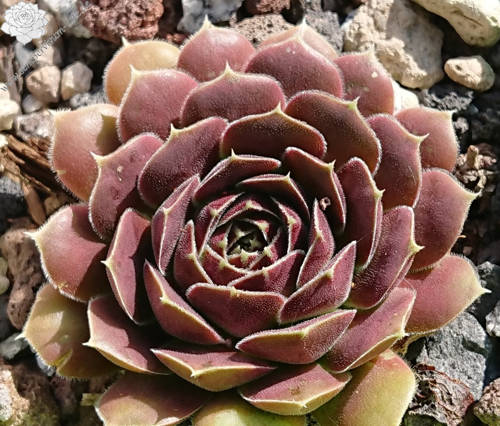 Rosetten bis 6cm, Blätter spatelig, kurz bespitzt, rotviolett, Blattränder mit hellem Streifen , bewimpert
