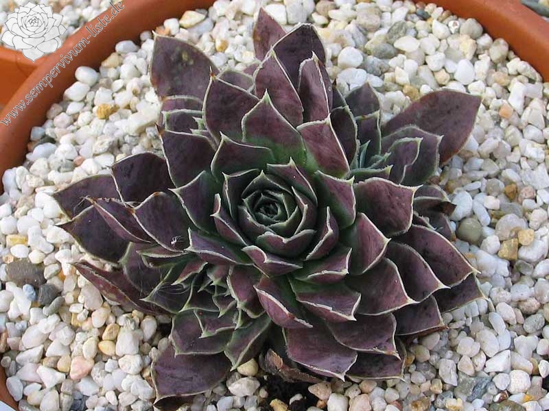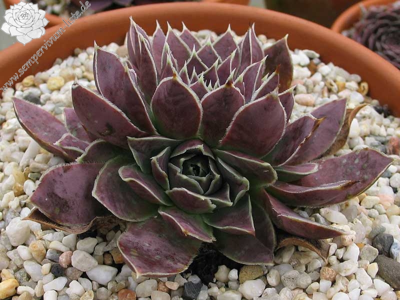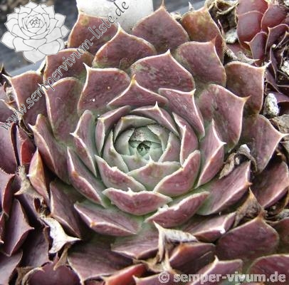 Eine britische Sorte von David Ford, ausgelesen in den 80er Jahren: Die Rosetten spielen mit grauen und violetten Tönen. Die Blätter sind mit auffallend heller Färbung umrandet.
