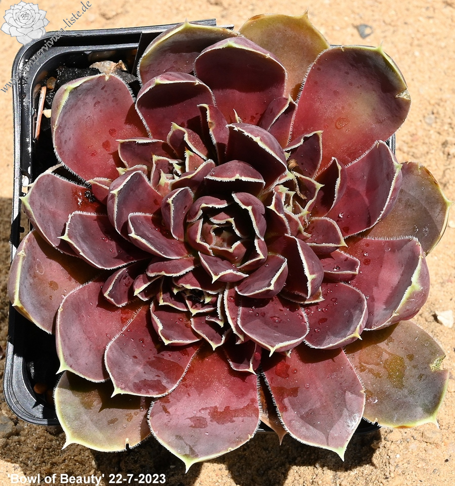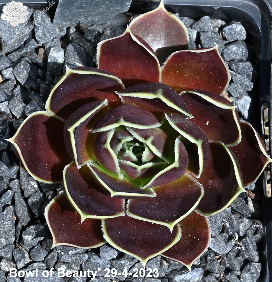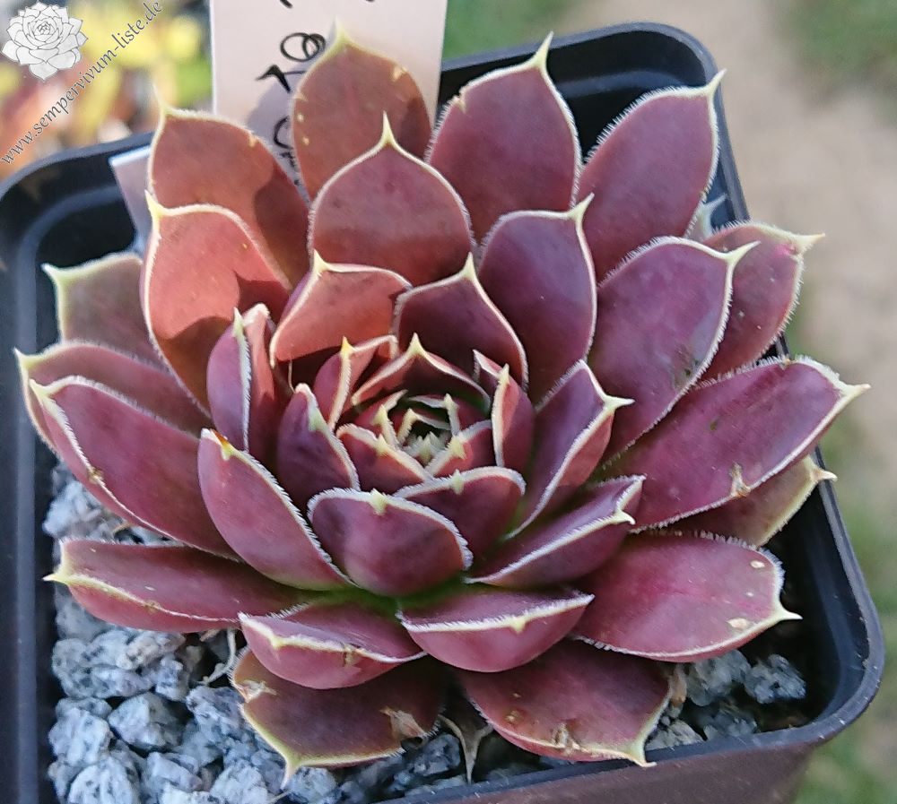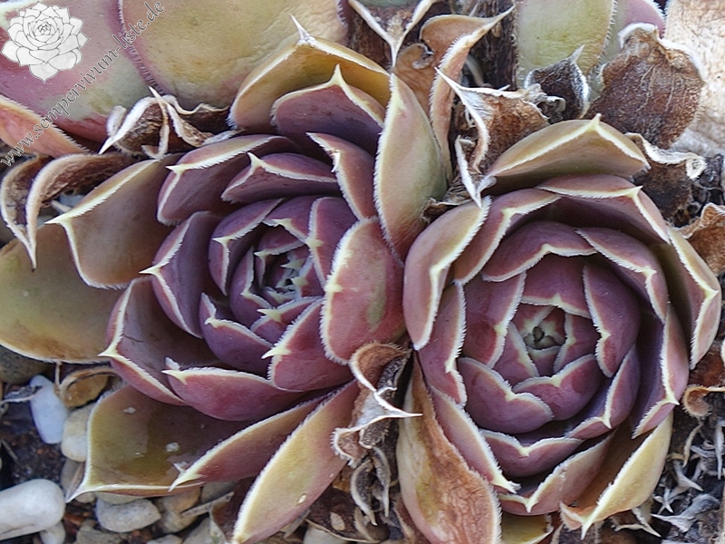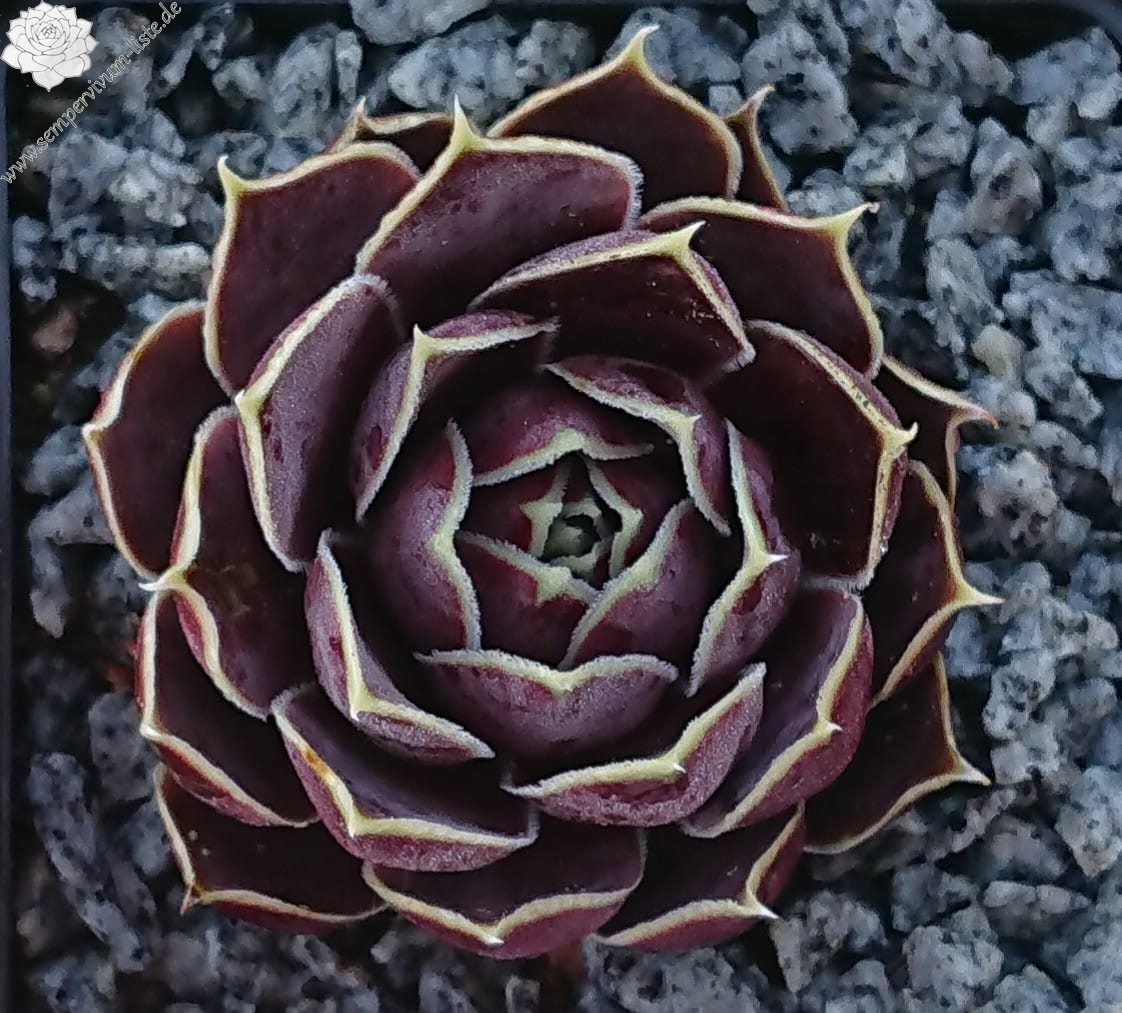 Rosetten bis 8 cm, Blätter oval, lang bespitzt, dunkles Lila, Blattränder hell