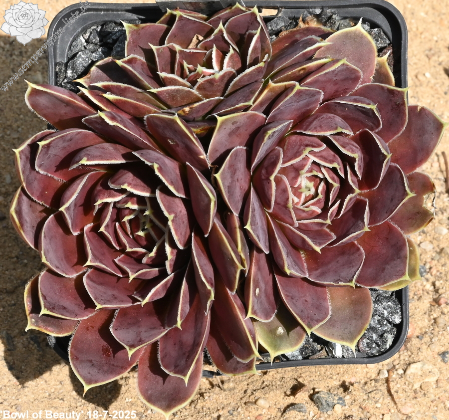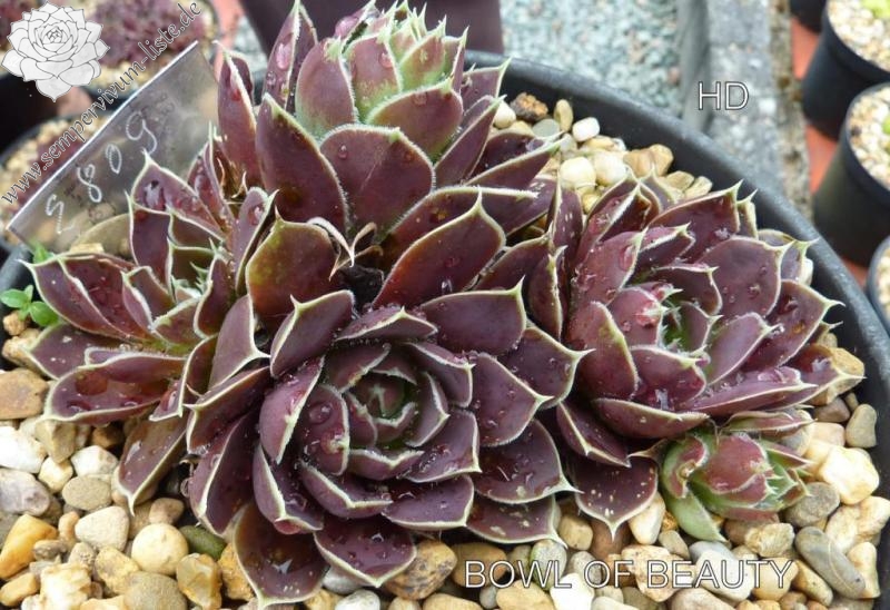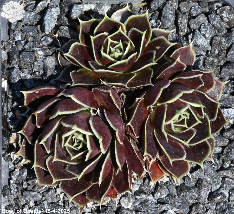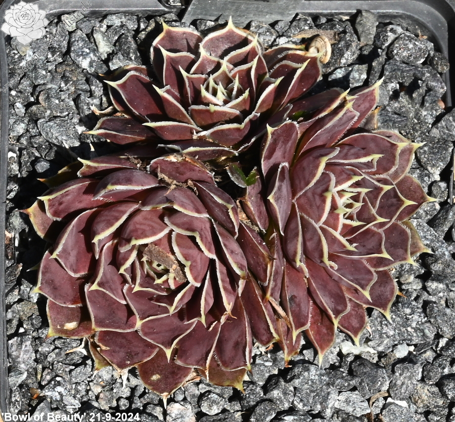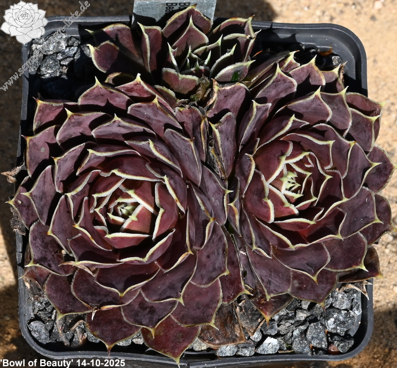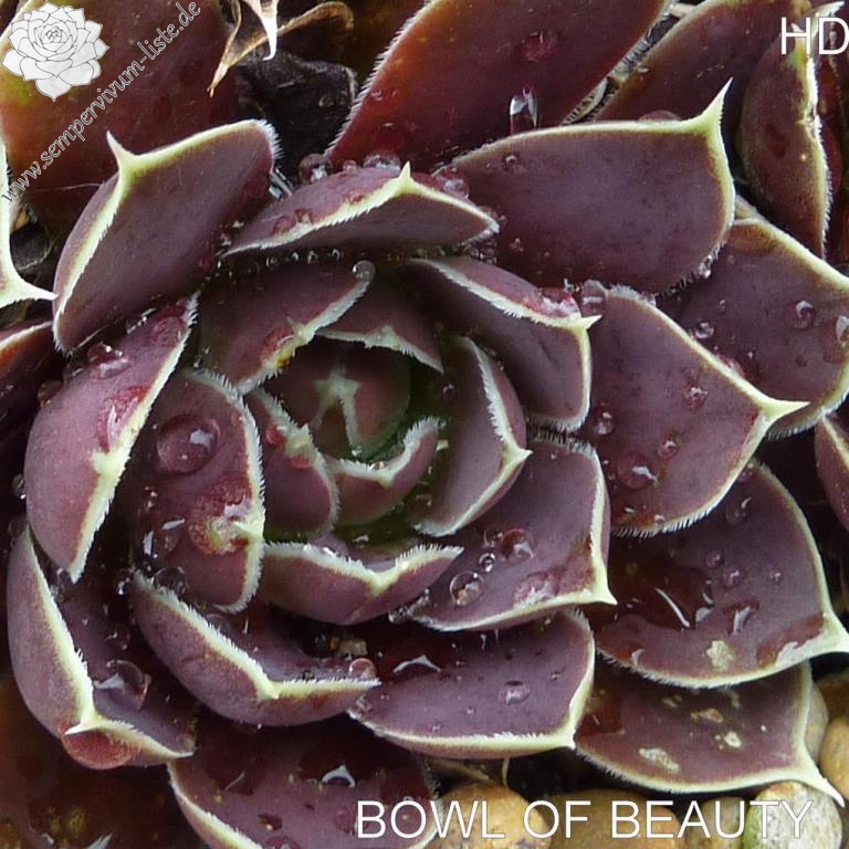 Rosetten bis 8 cm, Blätter oval, lang bespitzt, dunkles Lila, Blattränder hell