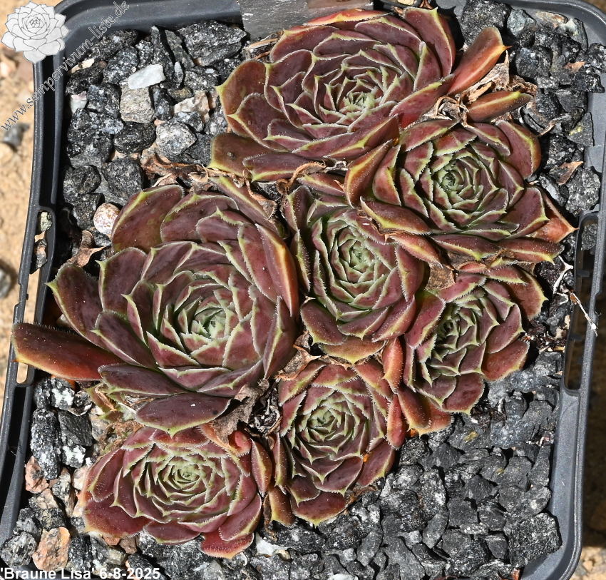 Rosetten bis 10 cm, Blätter rundlich, kurz bespitzt, Basis helles grün, Rest helles braun später in dunkles braun - rot übergehend, Ränder hellgrün, bewimpert, Aussaat 1999, Zufallssämling, benannt nach Lisa Schwaldt