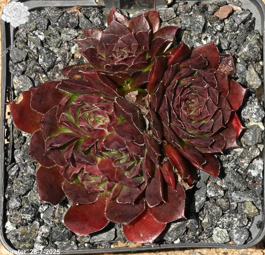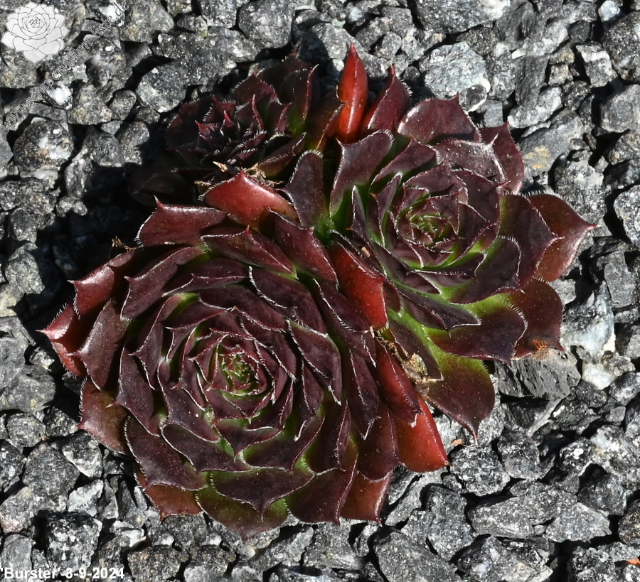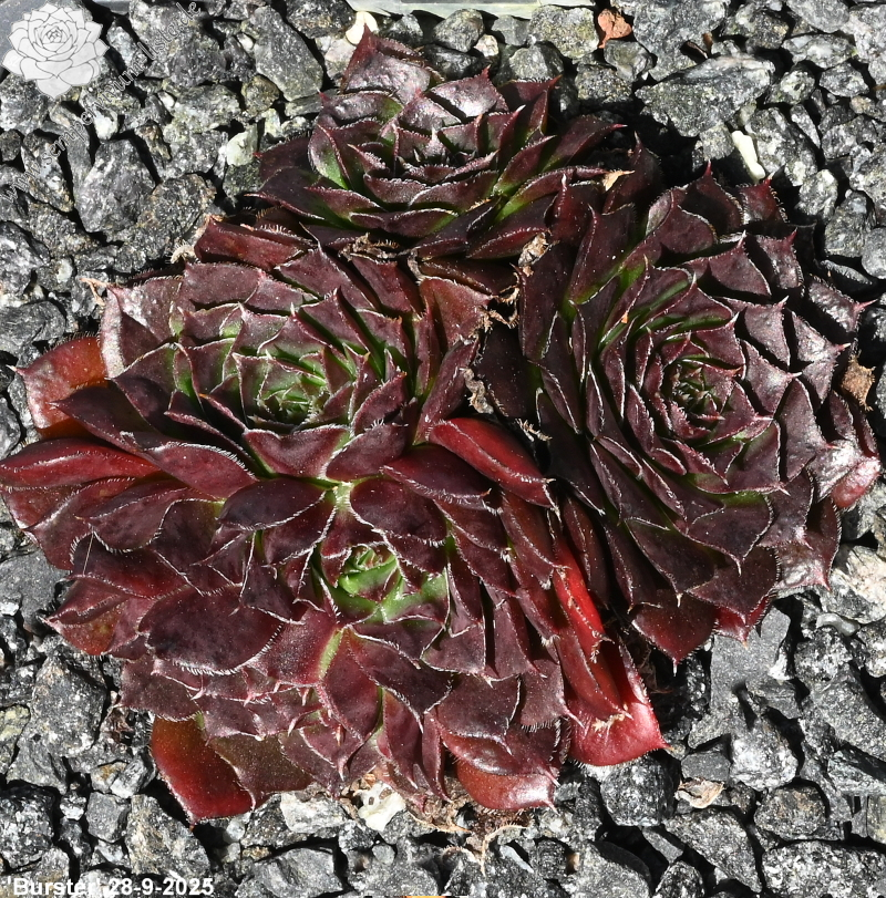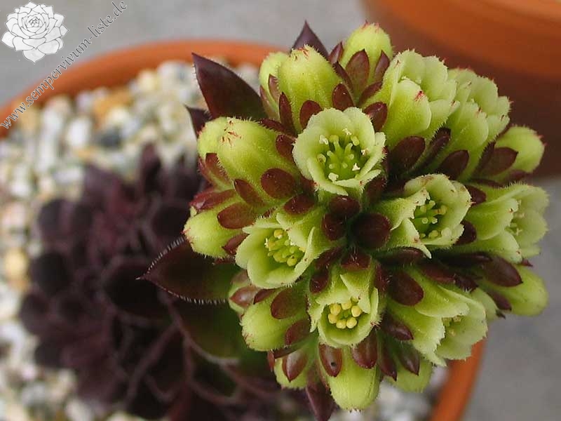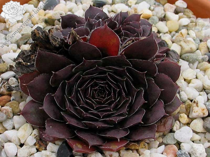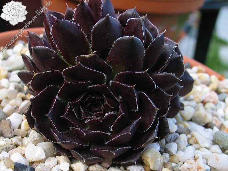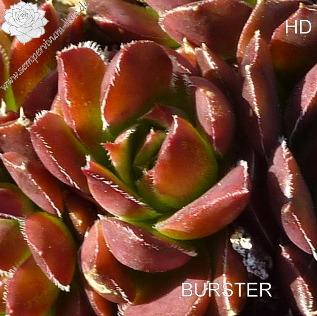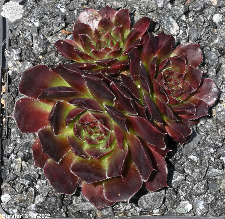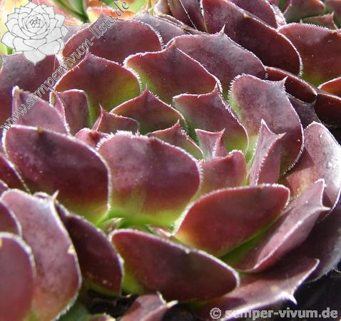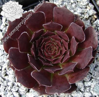Der rotbraune Kultivar stammt aus Deutschland und formt auffallend attraktive Rosetten: Die glatten Blätter sind am Rand weiß bewimpert und besitzen eine deutlich aufgesetzte Spitze. Die Färbung des Zentrums wechselt zum Sommer zu leuchtendem Smaragdgrün.