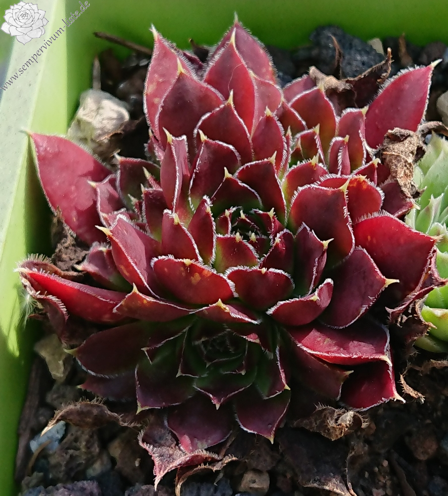 Rosetten bis 8 cm, Blätter oval, lang bespitzt, weinrot