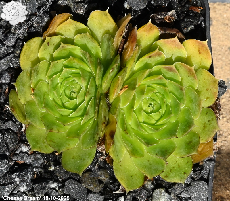 Ein neuer Jovibarba Sämling aus der ‚Cheese’-Serie, der über viele Jahre gute Eigenschaften gezeigt hat. Im Frühjahr besitzt er nur eine leichte orange Färbung an den Blattenden. Im Sommer sind die Pflanzen im Zentrum hellgrün, die Blattenden werden heller und gehen mehr ins Gelb über. Die Blattspitzen zeigen eine leichte orange Färbung. Es handelt sich um eine wüchsige, unempfindliche Pflanze, die sich gut teilen läst.