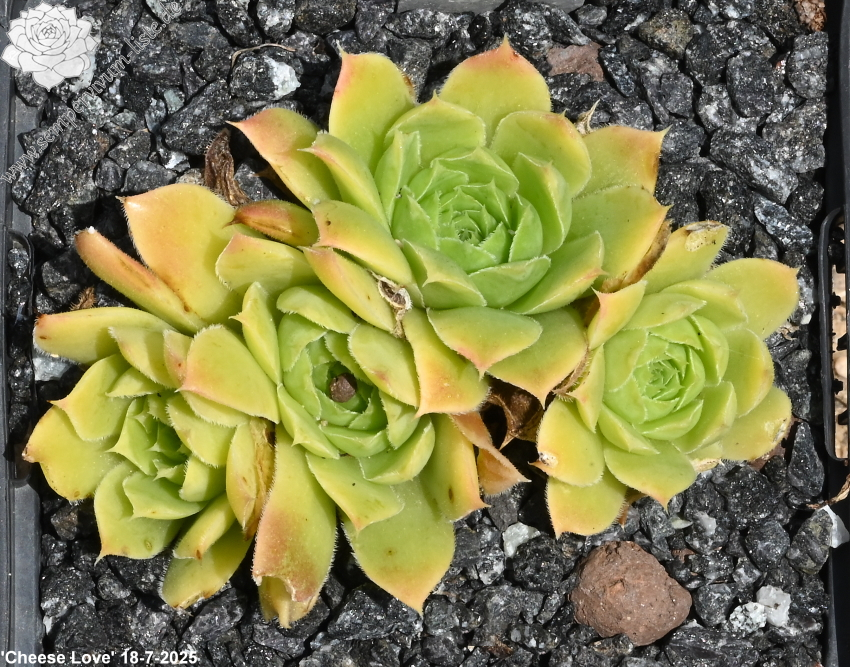 Besitzt sehr gute Eigenschaften. Die Rosetten sind fast ganz einheitlich gelb gefärbt. Nur an den Blattenden zeigen sich schwache orange Spuren. Im Rosettenzentrum hebt sich ein kleines grünes Herz deutlich ab. Im Frühjahr färben sich die Rosetten langsam von innen heraus grünlich. Eine wüchsige Pflanze, die sich gut teilen lässt.