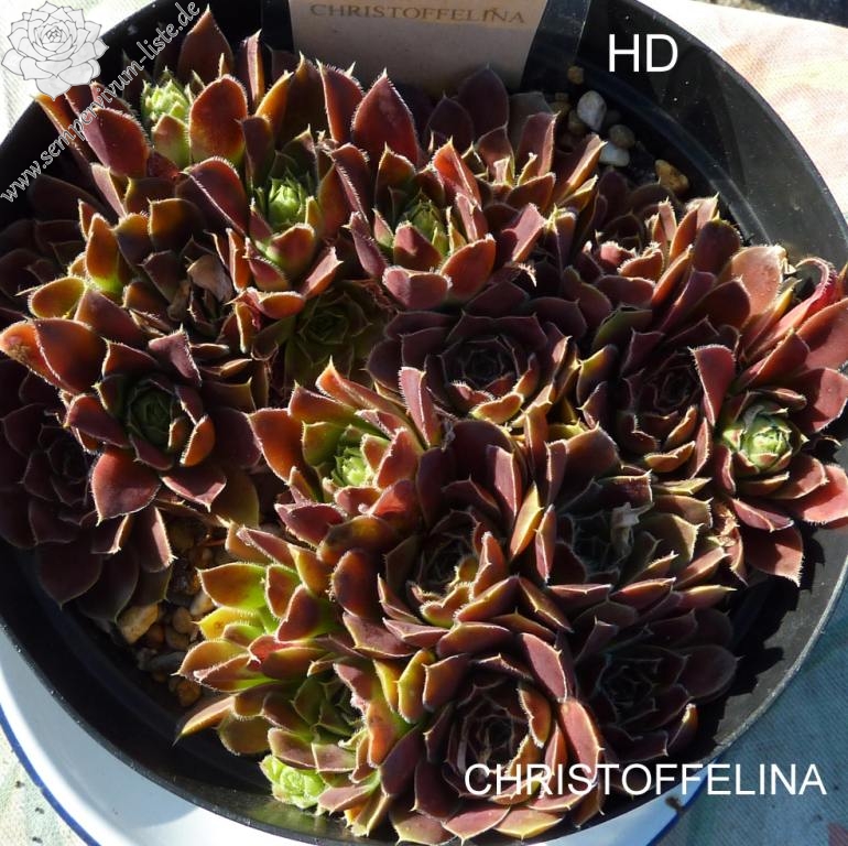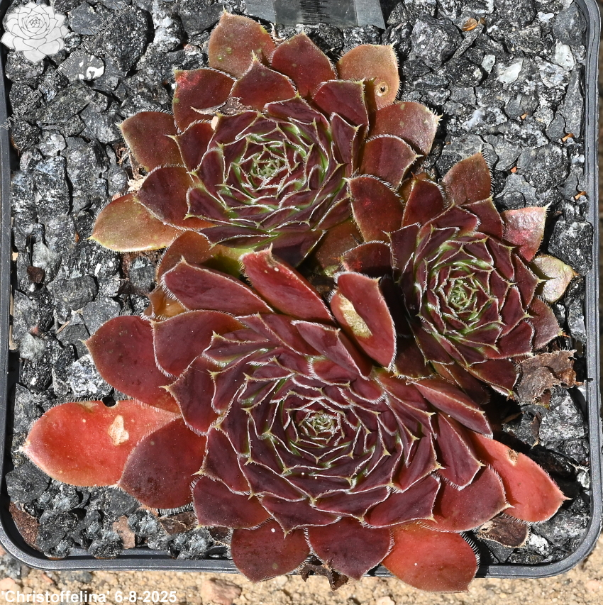 Eine attraktive Namenssorte mit rotbraunen Rosetten. Auffällig sind die stark bewimperten Blatträndern, die zu einem silbrigen Glanz verhelfen.