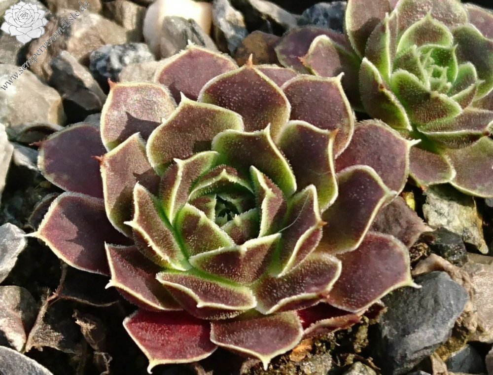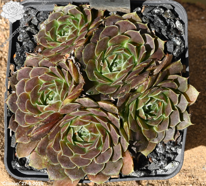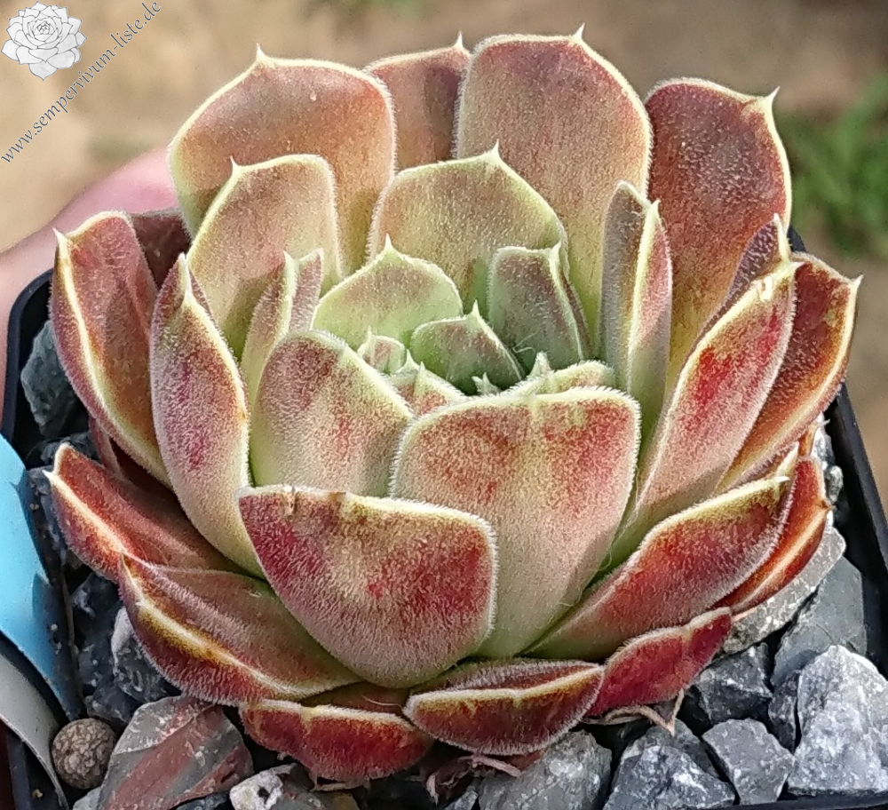 Eine recht unbekannte, auffallend attraktive Hybride aus Großbritannien. Sie formt kleinere, jadegrüne Rosetten mit hellbraunen bis bronzefarbenen Nuancen. Ungewöhnlich breit sind auch die Blätter.