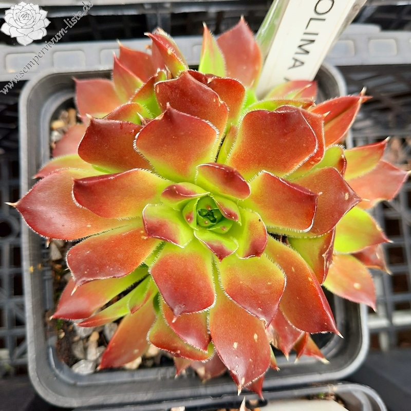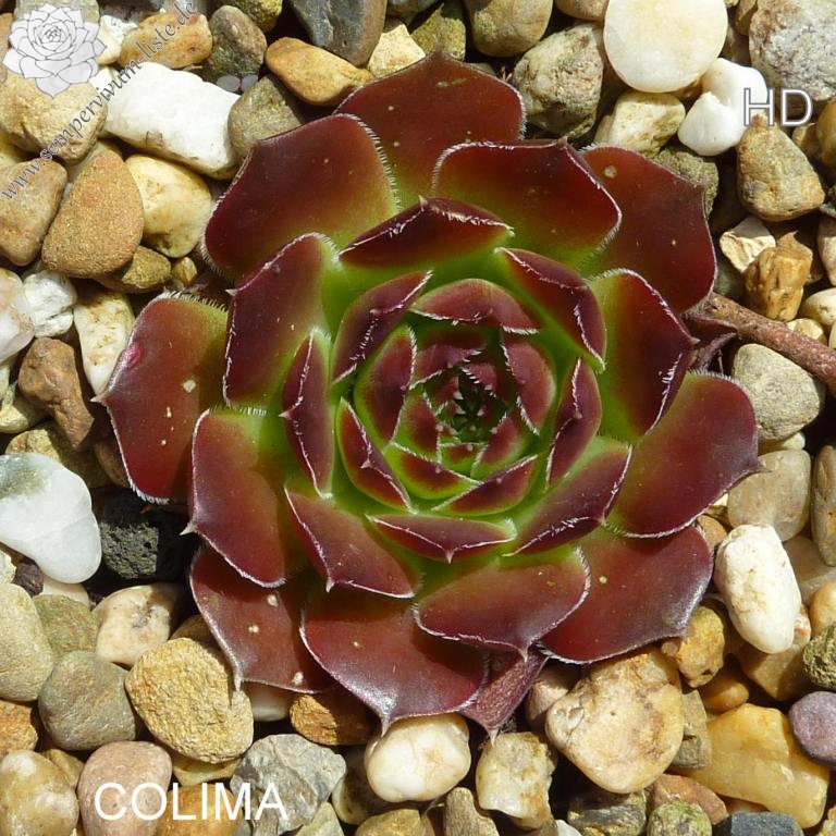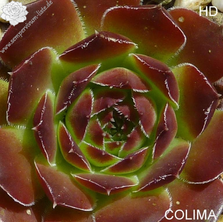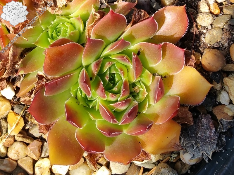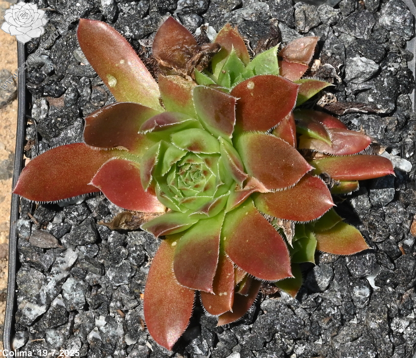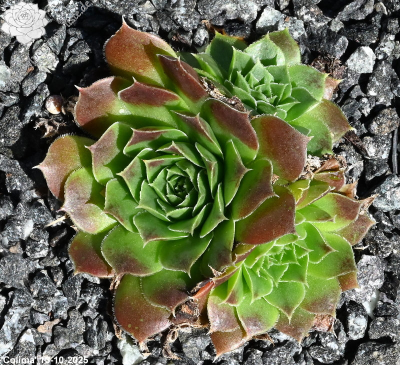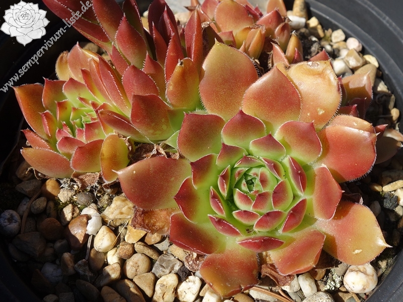 kleine Rosetten, Blätter keilförmig, kurz bespitzt, Basis helles Grün, obere Blattdrittel kastanienbraun, Ränder bewimpert