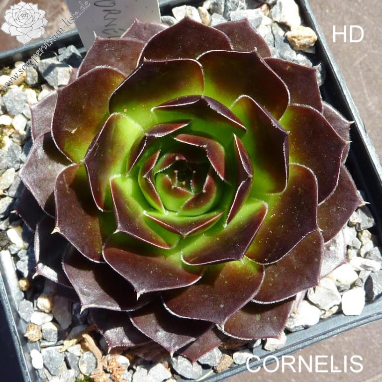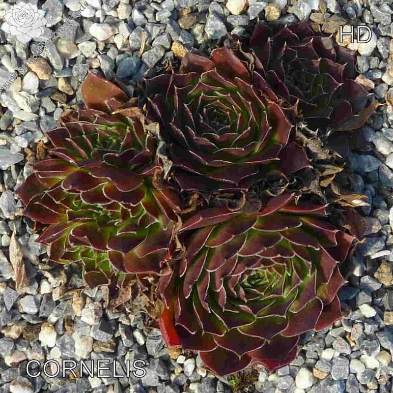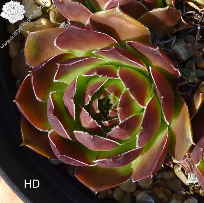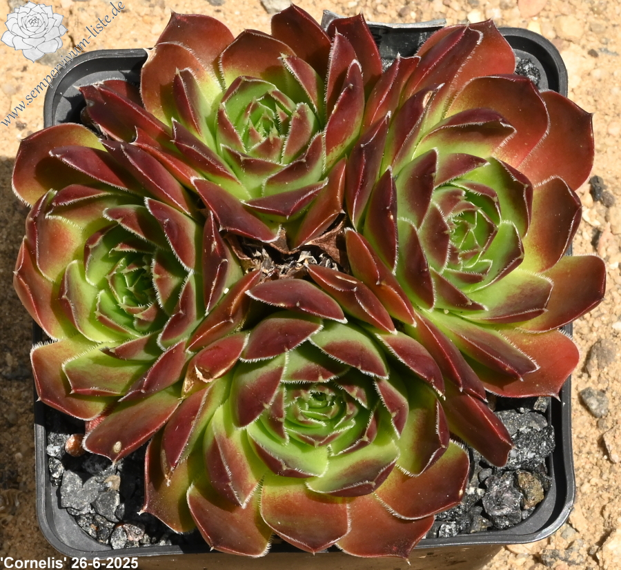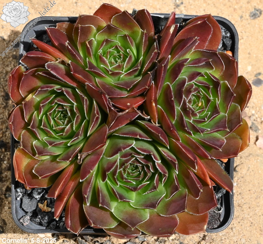 benannt nach Cornelis Versteeg, Rosetten bis 7 cm, Blätter rund, Herz lindgrün, Spitzen kräftiges Braun rot, Ränder leicht bewimpert