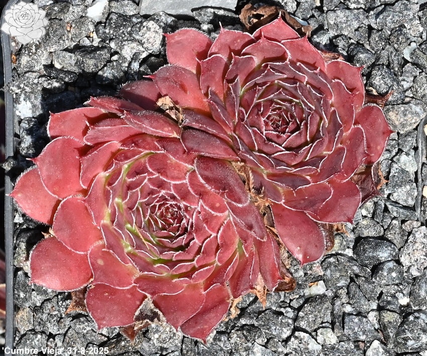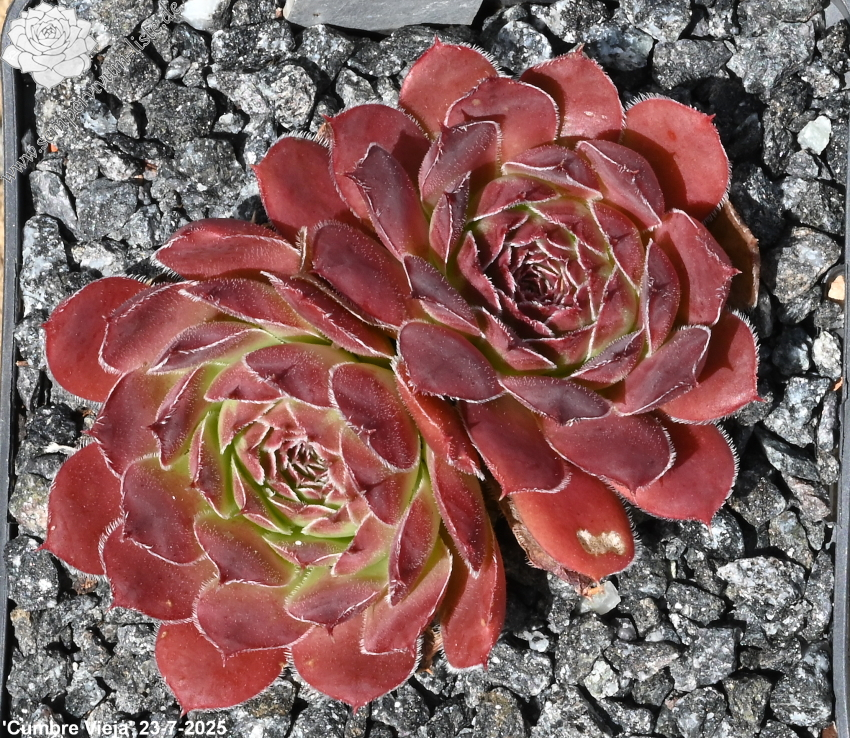 Rosetten bis 5 cm, Blätter rundlich, kurz bespitzt, burgunderrot, Ränder bewimpert