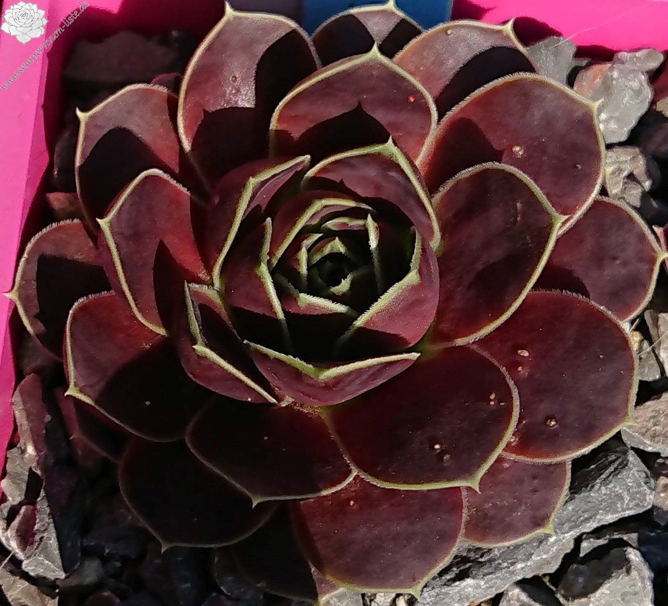 kleine Rosetten, Blätter eiförmig, kurz bespitzt, dunkles Rotbraun, Blattränder gelb