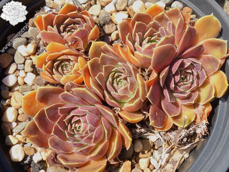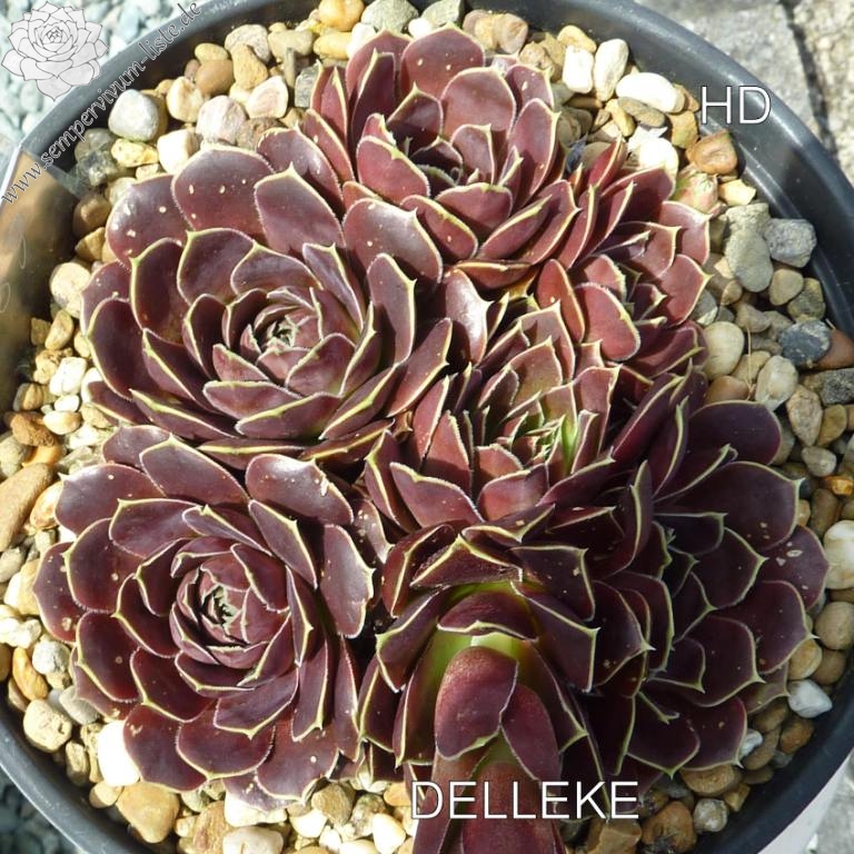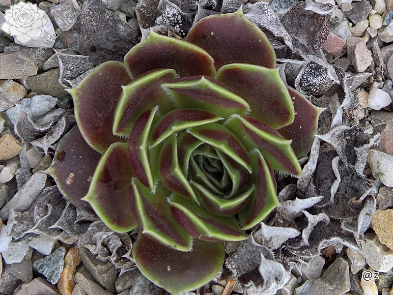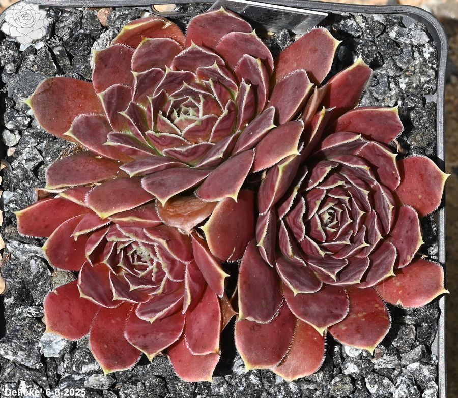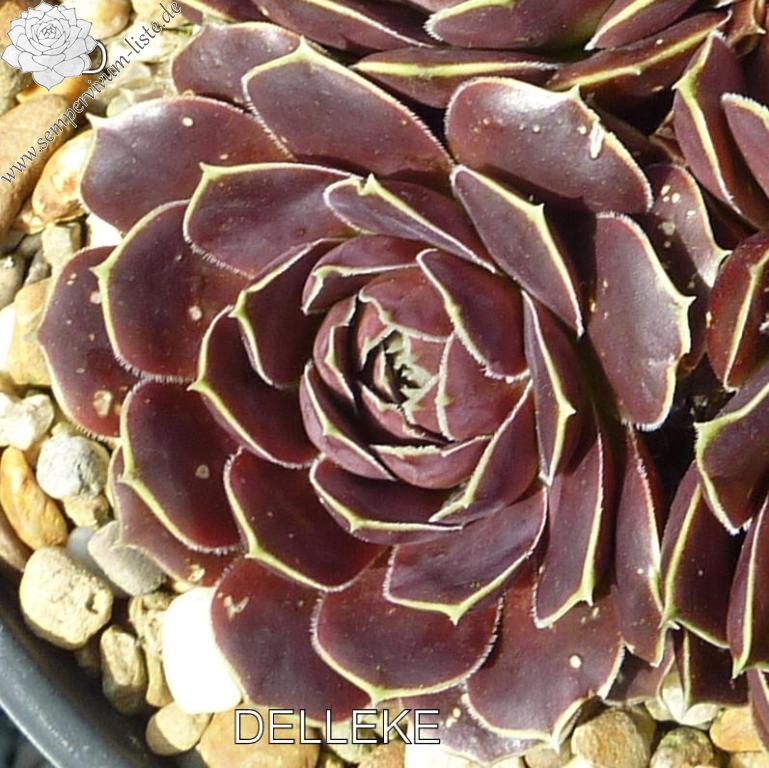 Rosetten bis 6 cm, Blätter rundlich, kurz bespitzt, purpurrot - weinrot , Blattränder gelblich