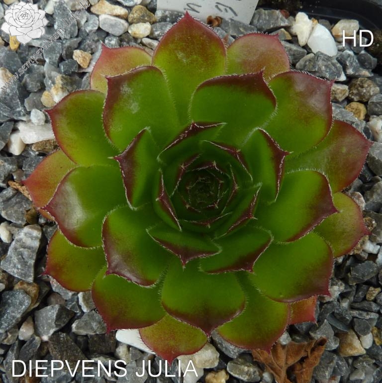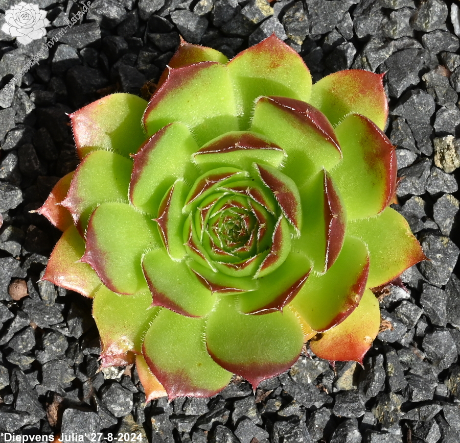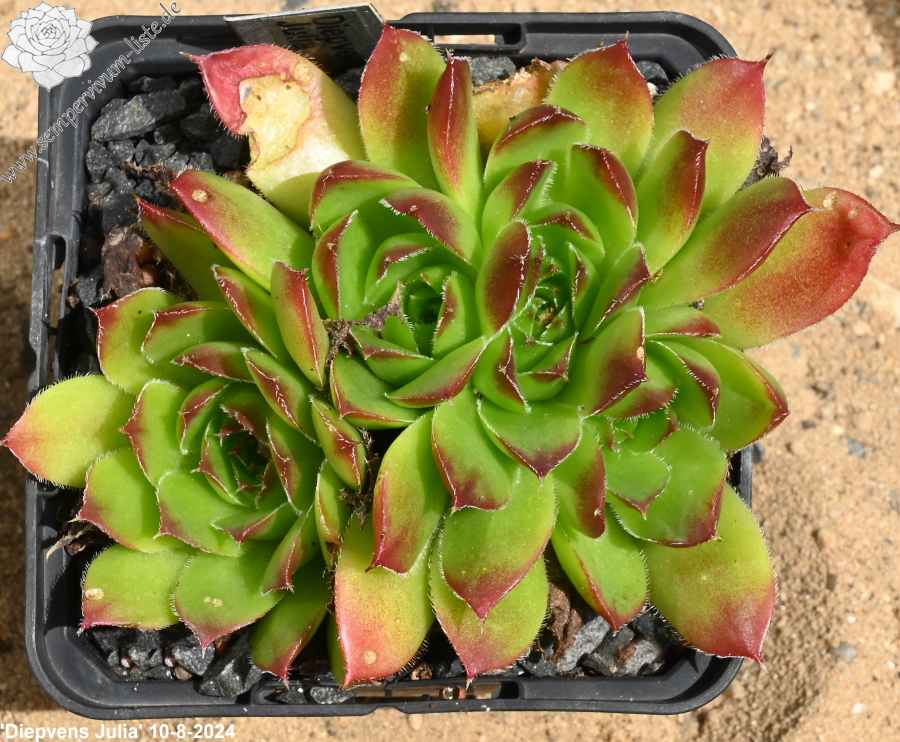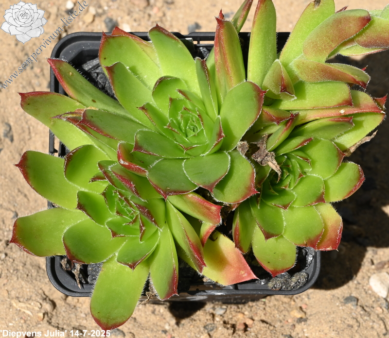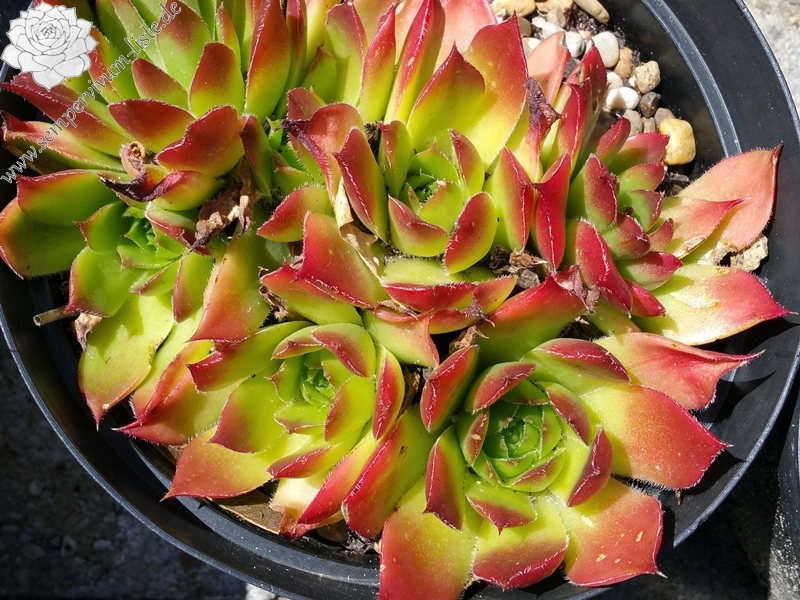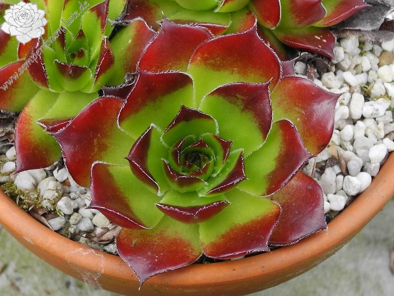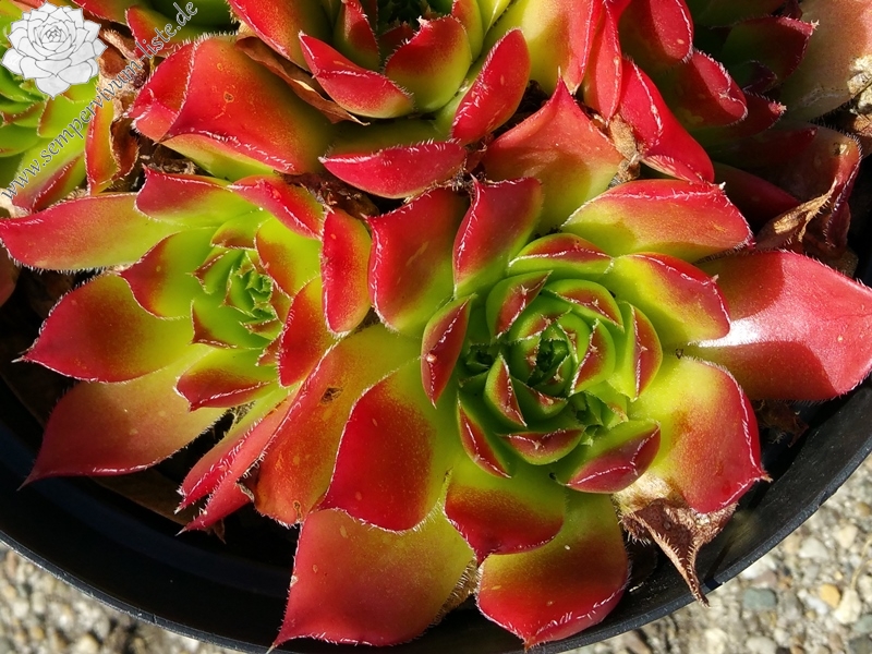 Eine belgische Sorte mit recht großen Rosetten in grüner Färbung. Sie sind wenig beblättert und die Spitzen in der lichtreichen Zeit in leuchtendes Rot getaucht.