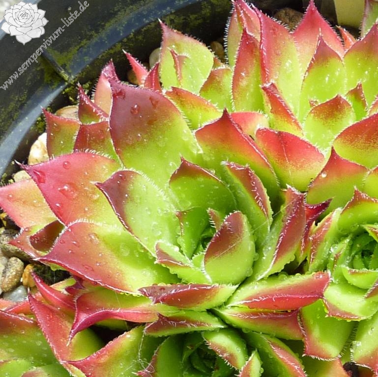 kleine Rosetten helles Grün, Blattspitzen helles Rot, Blattränder bewimpert.