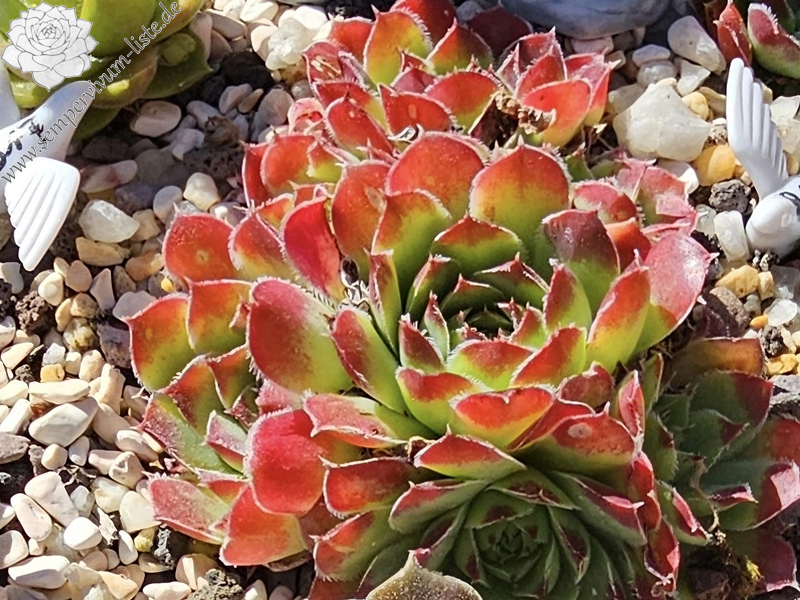 Rosetten bis 7 cm, Blätter oval, hellgrün, obere Blattdrittel leuchtendes Rot, später in grün übergehend, Blattränder leicht bewimpert