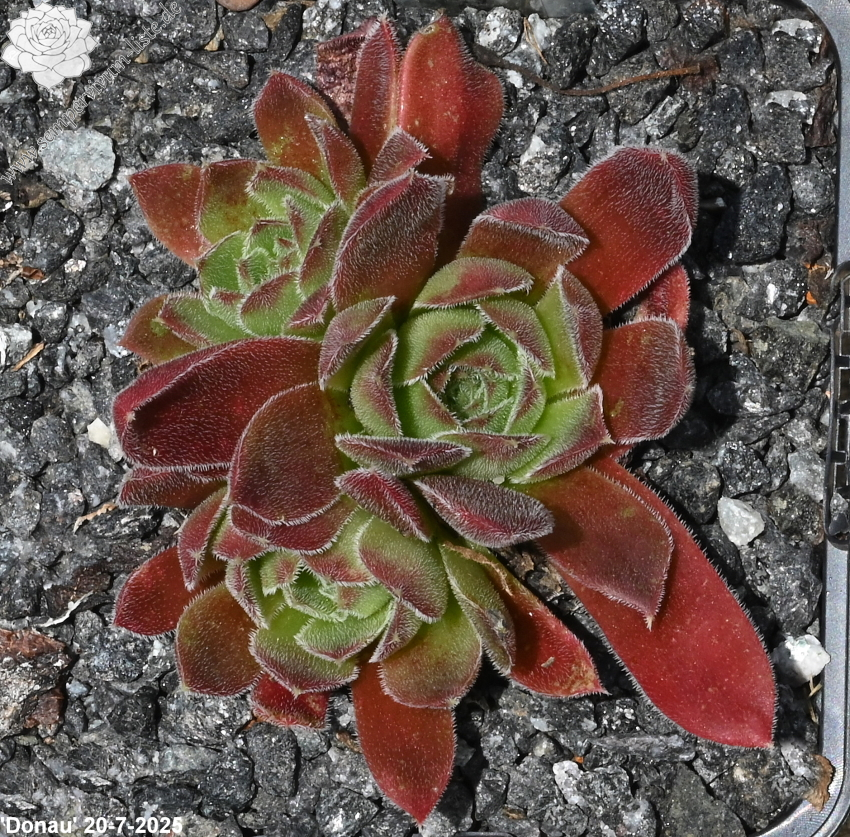 Rosetten bis 6 cm, Blätter lanzettlich, lang gespitzt, Blattoberfläche samtig, Basis hell, Rest dunkles Rot, Blattränder bewimpert
