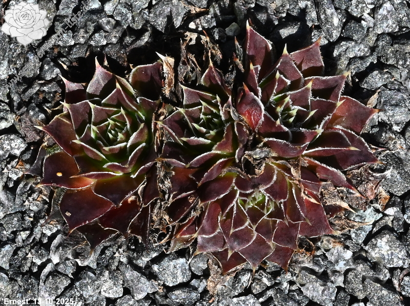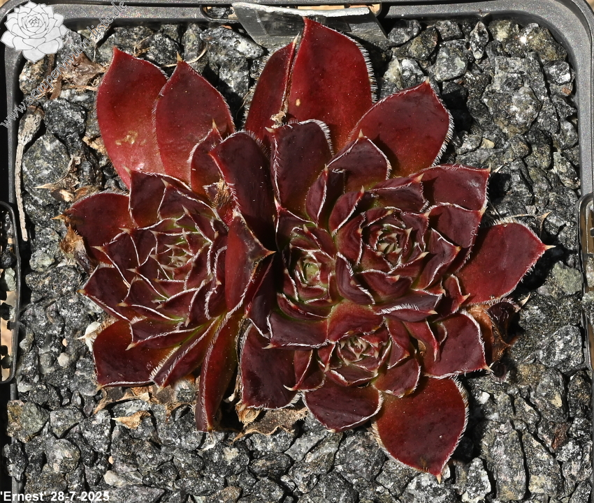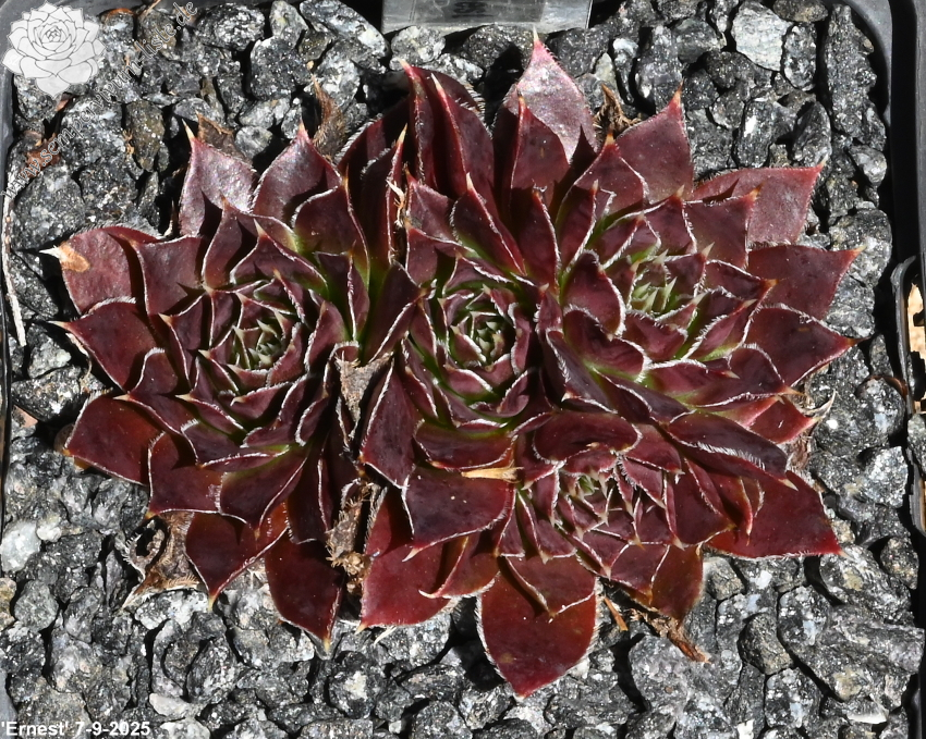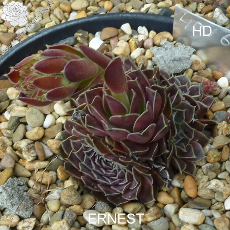 Rosetten bis 6 cm, Blätter oval, lang bespitzt, weinrot - schwarzrot, Blattränder hell