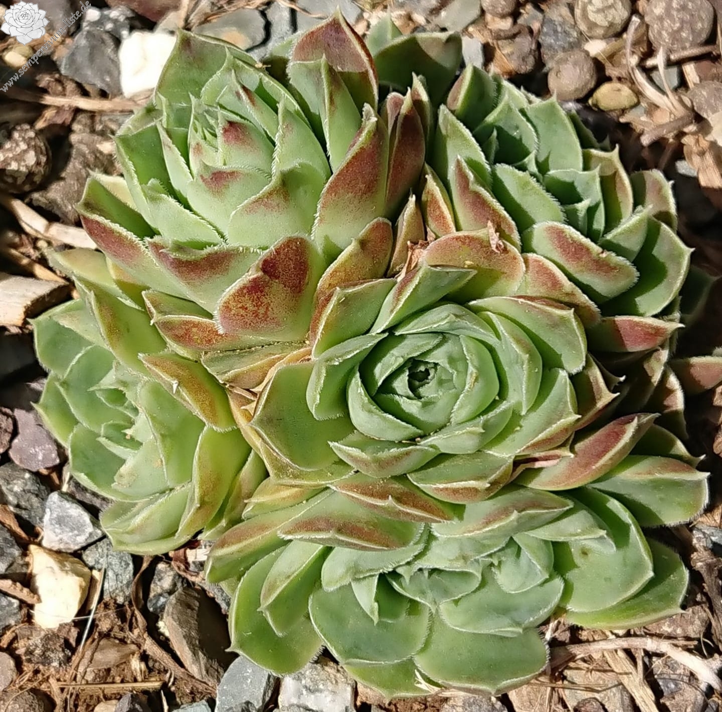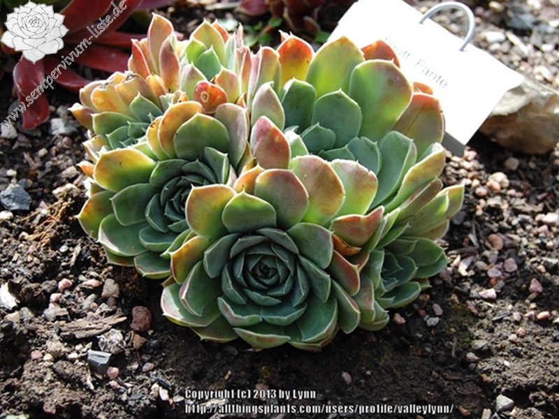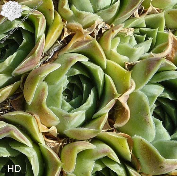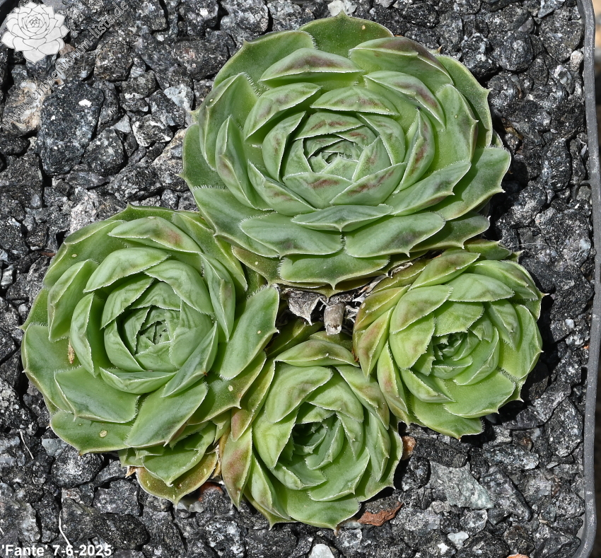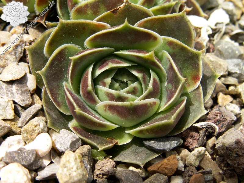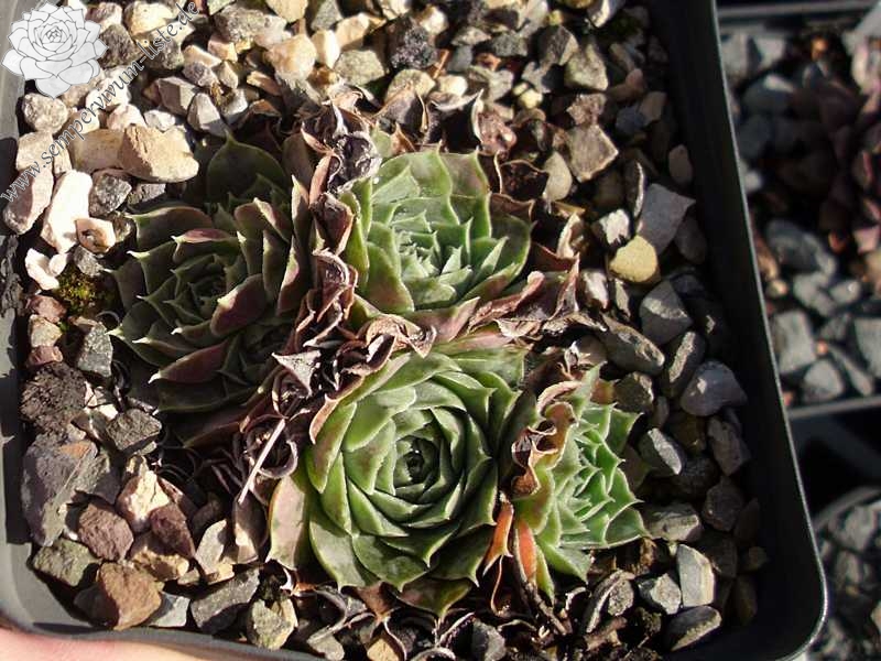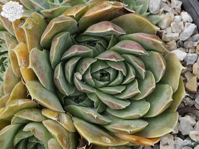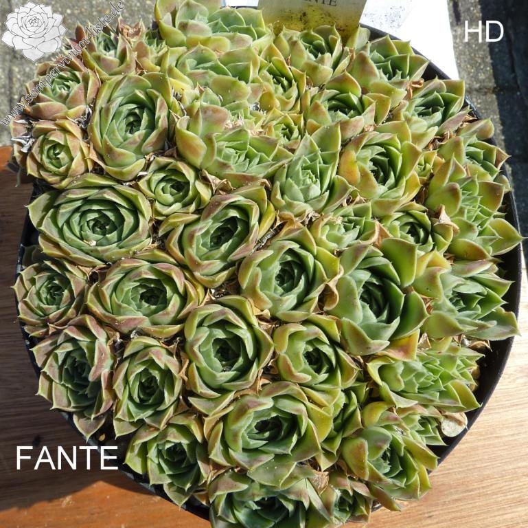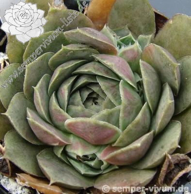 Kleinere Rosetten in jade- bis olivgrünen Tönen mit grau überzogen Schattierungen. Der belgische Klon wurde im Jahre 1990 benannt.