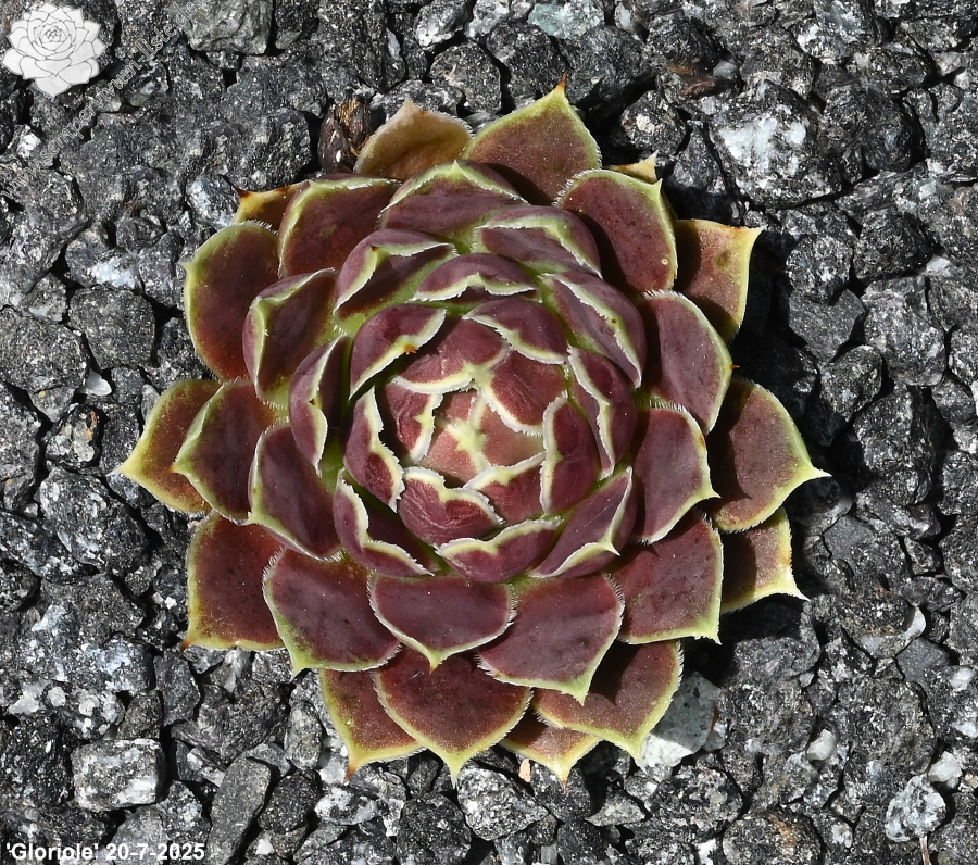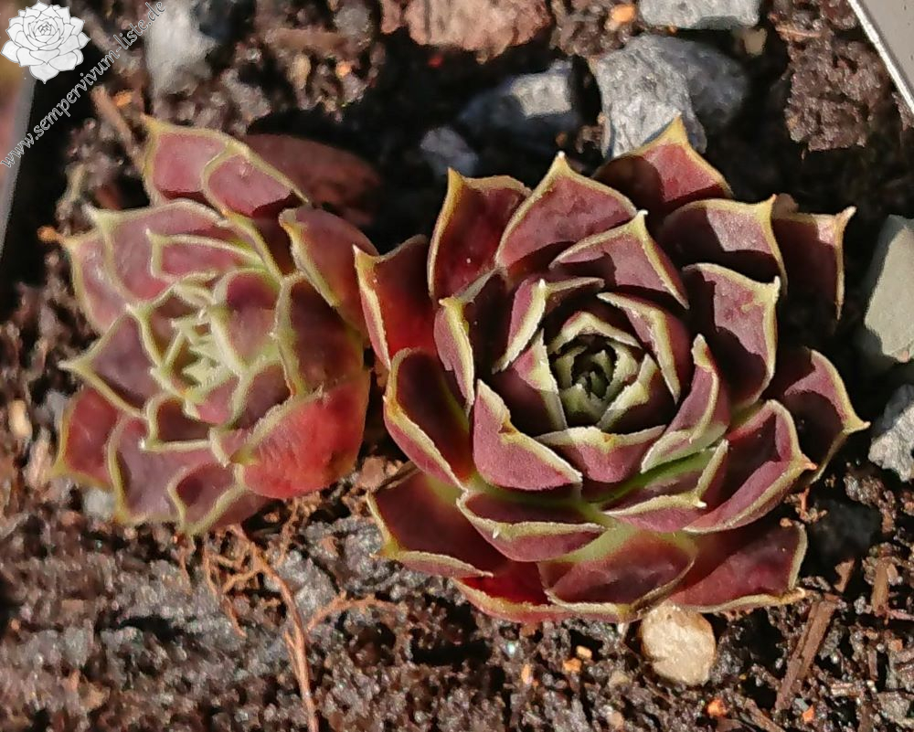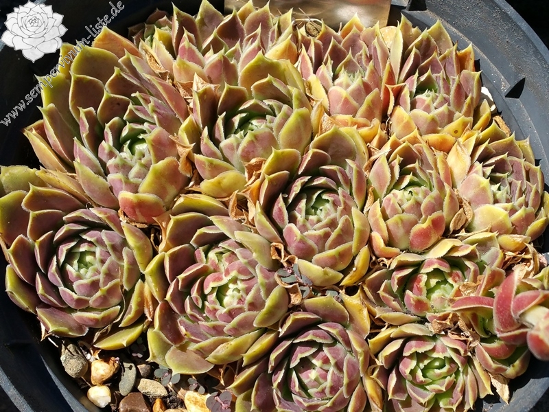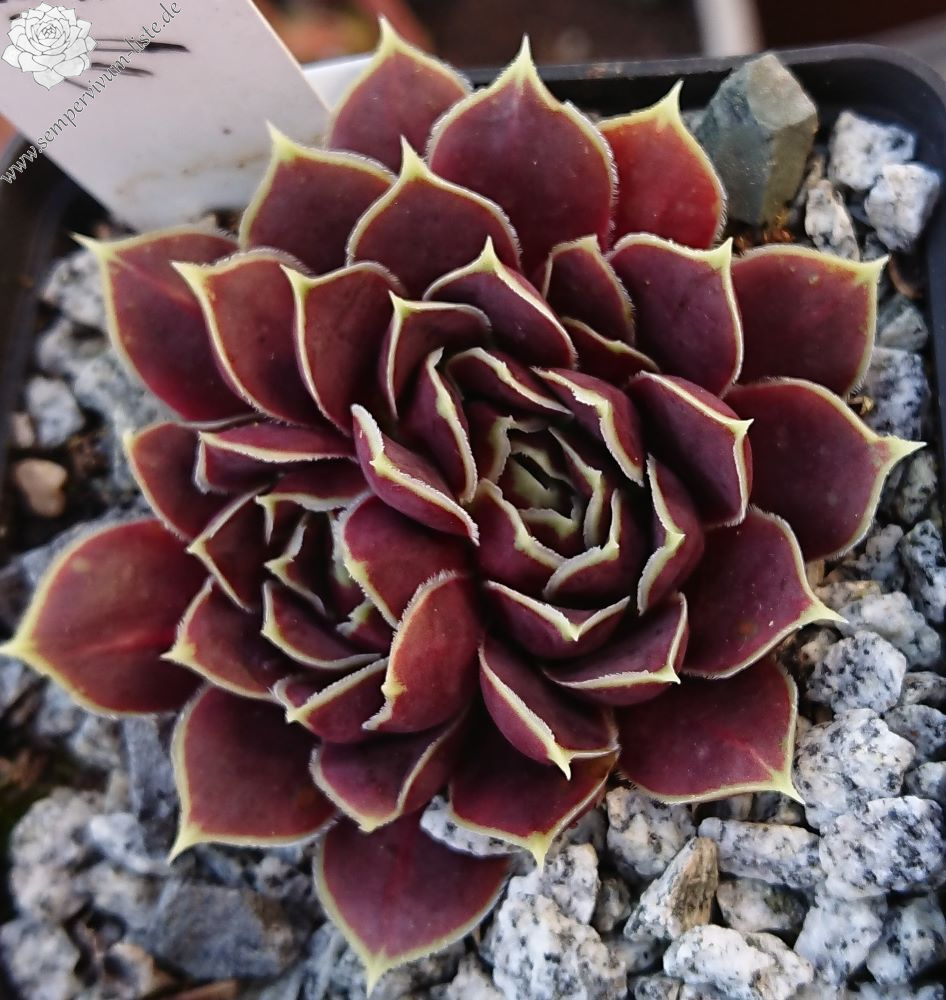 mittlere Rosetten, Basis rötlich-lila, Blattspitzen und Ränder gelblich-grün, Ränder kurz bewimpert