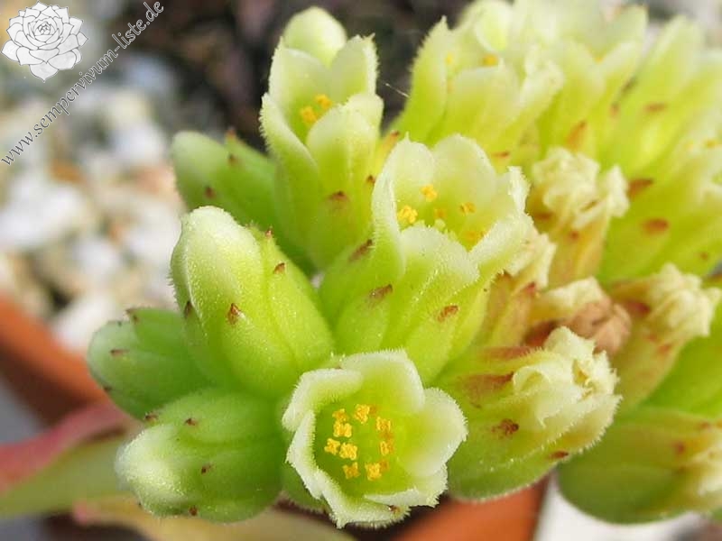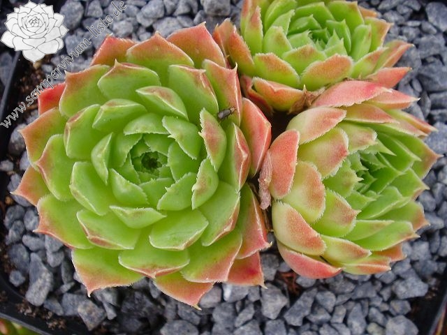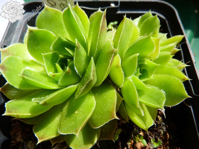 Rosetten bis 5 cm, eiförmige Blätter, lang bespitzt, helles Grün mit rot - braunen Spitzen, Blattränder bewimpert