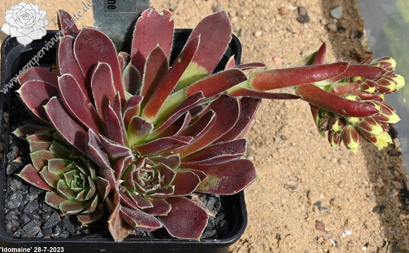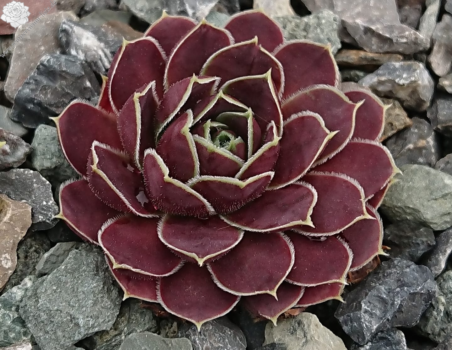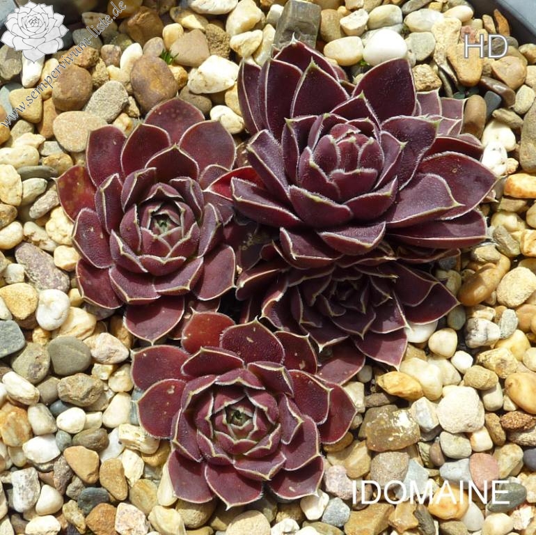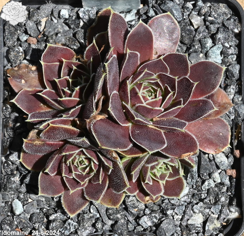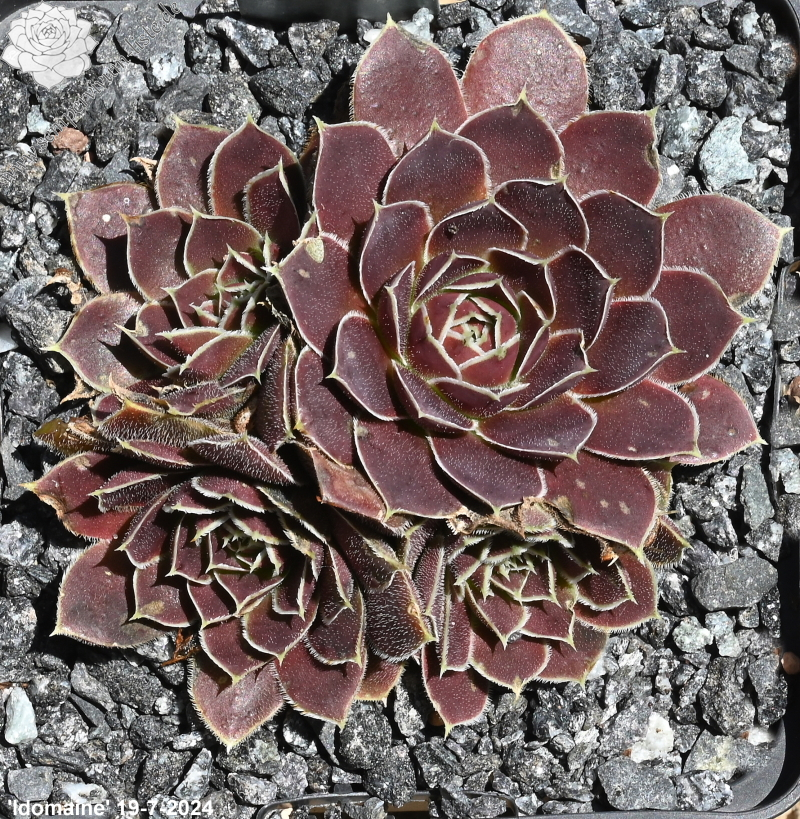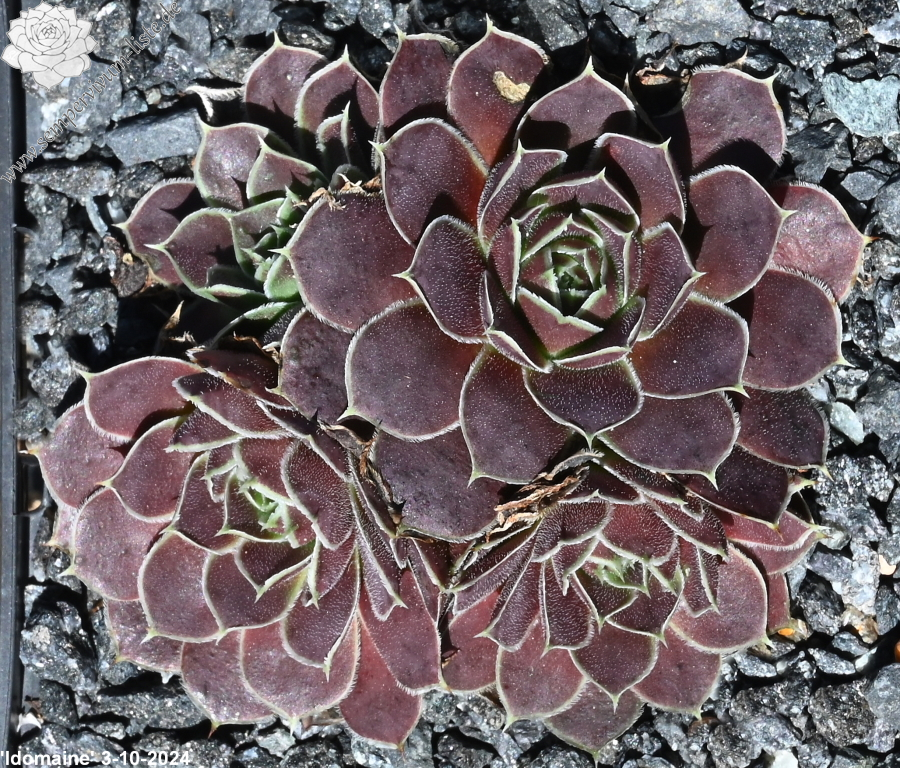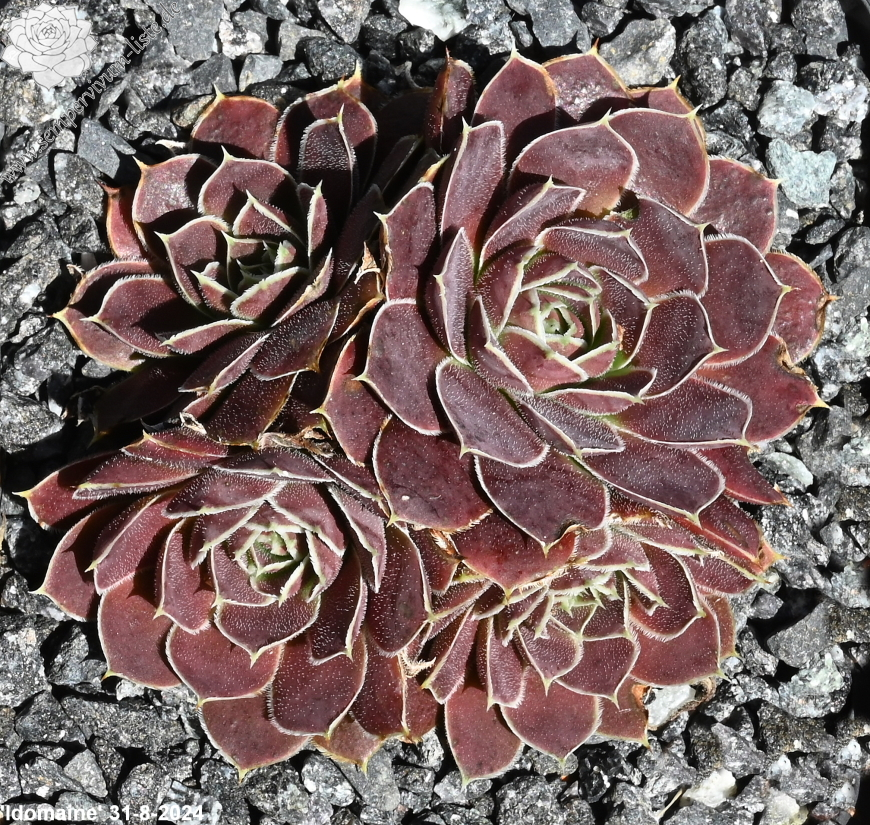 Rosetten bis 5 cm, Blätter verkehrt eiförmig, kurz bespitzt, samtige Substanz, rotviolett - oxidrot, Blattränder hell, bewimpert