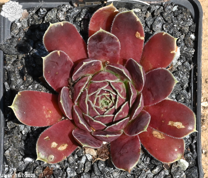 Rosetten bis 6 cm, Blätter rundlich, kurz bespitzt, rotlila - altrosa, Herz hellgrün, Blattränder hell