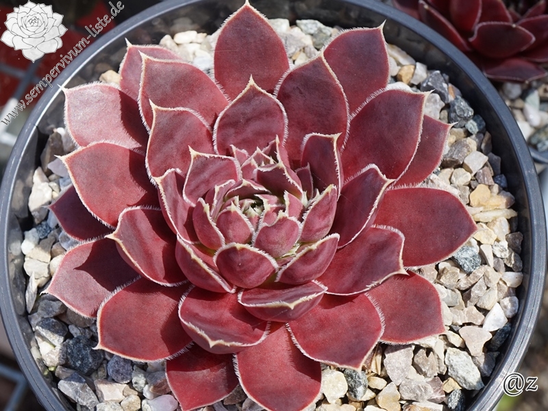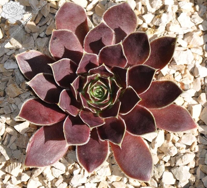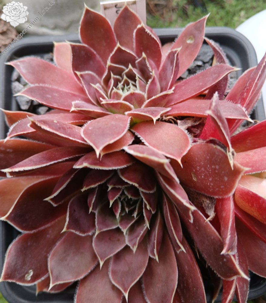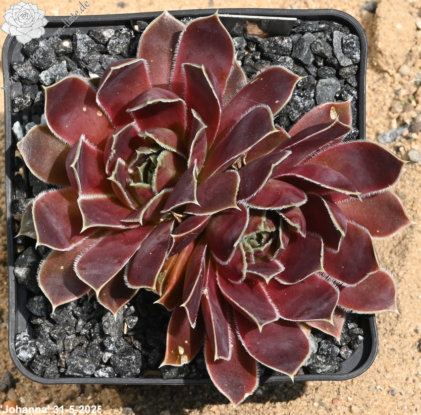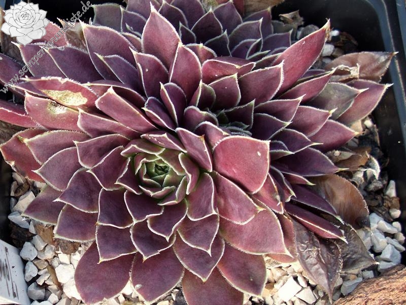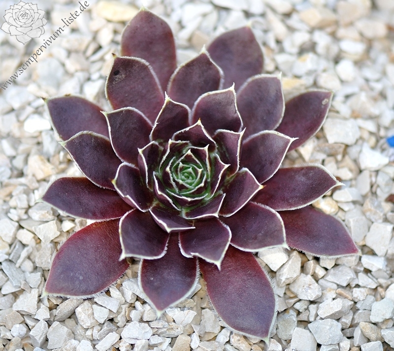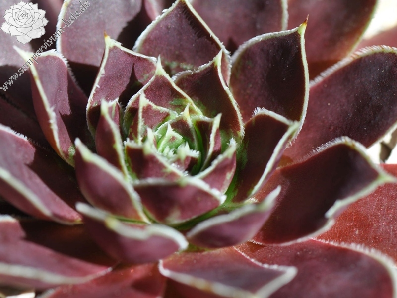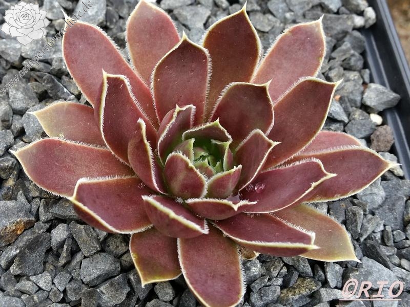 Rosette bis 13 cm, rotbraun-eisenoxid-lila, etwas bereift, Blätter eher schmal, Blattränder insbesondere in der heranwachsenden Phase grün kontrastierend, danach weiß, Blätter unten grün, hält die Farbe, robuste Pflanze, Absaat von Sempervivum heuffelii 'Plaisir de Manuel'.