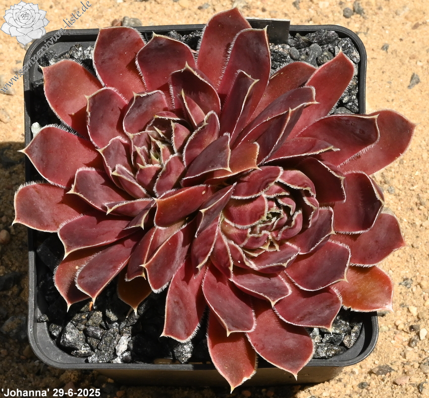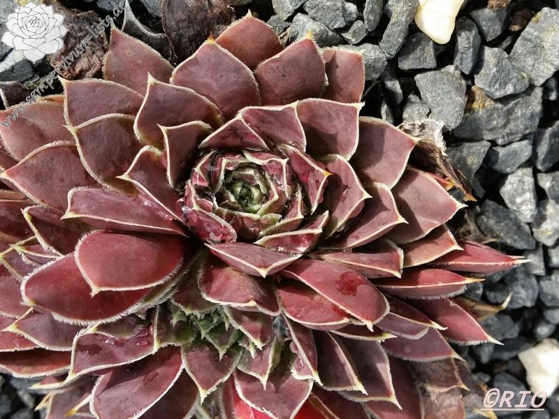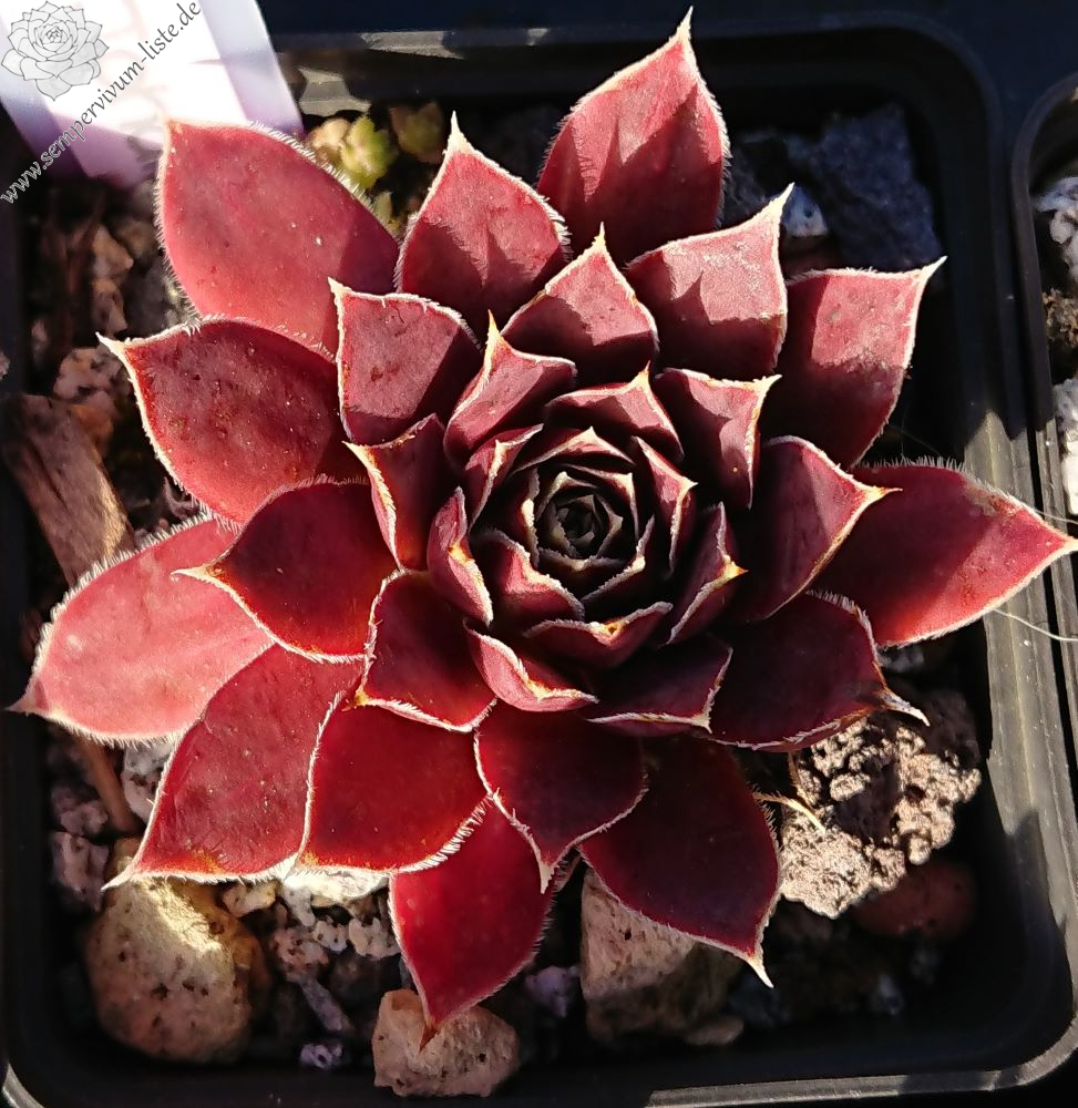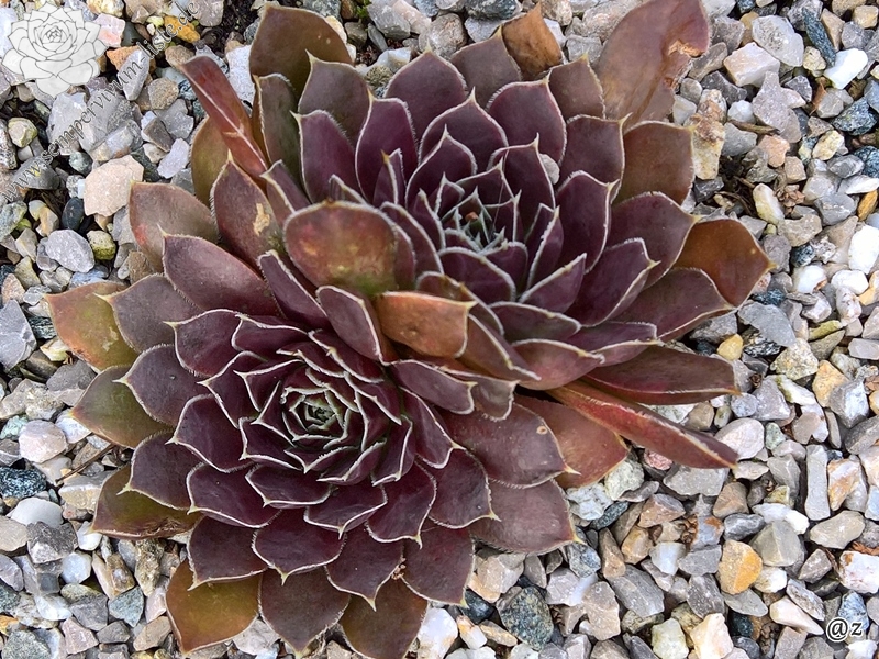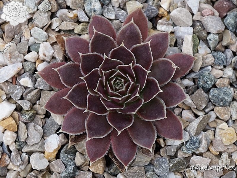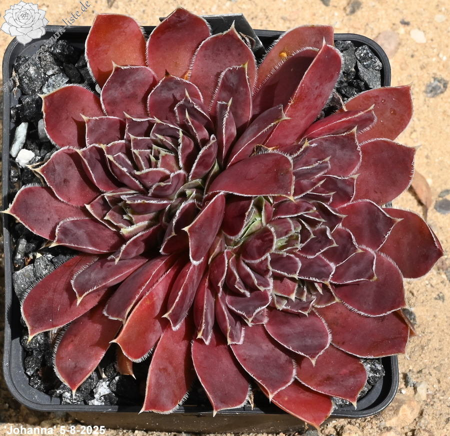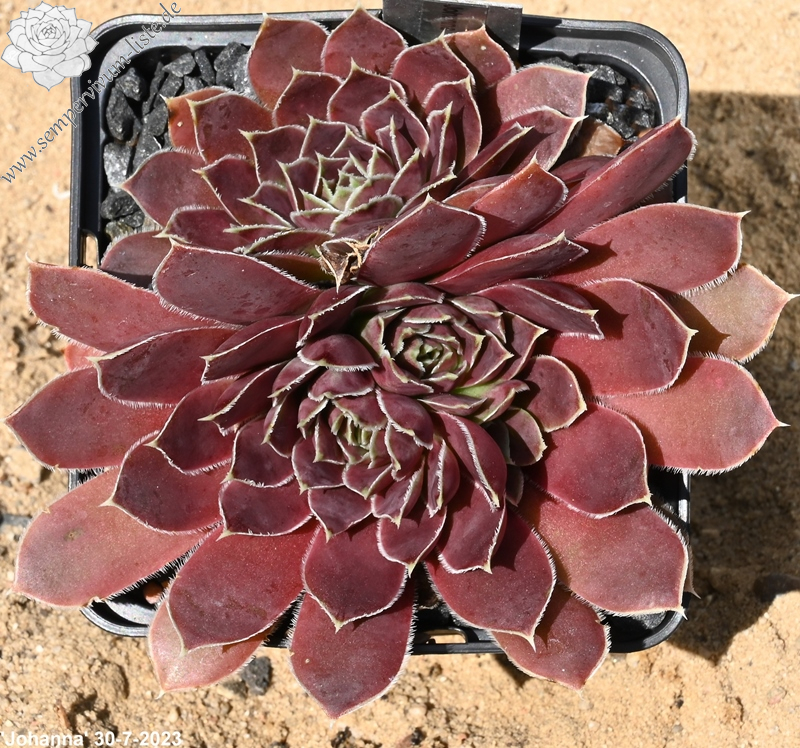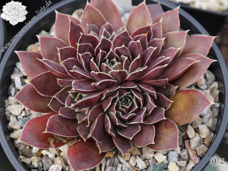 Rosette bis 13 cm, rotbraun-eisenoxid-lila, etwas bereift, Blätter eher schmal, Blattränder insbesondere in der heranwachsenden Phase grün kontrastierend, danach weiß, Blätter unten grün, hält die Farbe, robuste Pflanze, Absaat von Sempervivum heuffelii 'Plaisir de Manuel'.