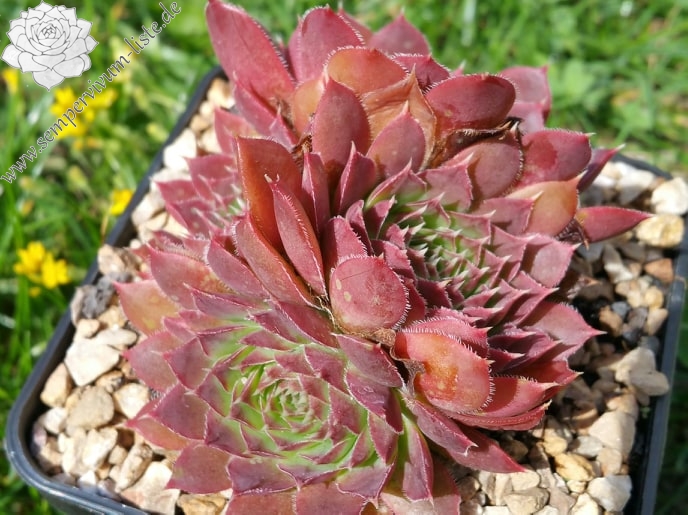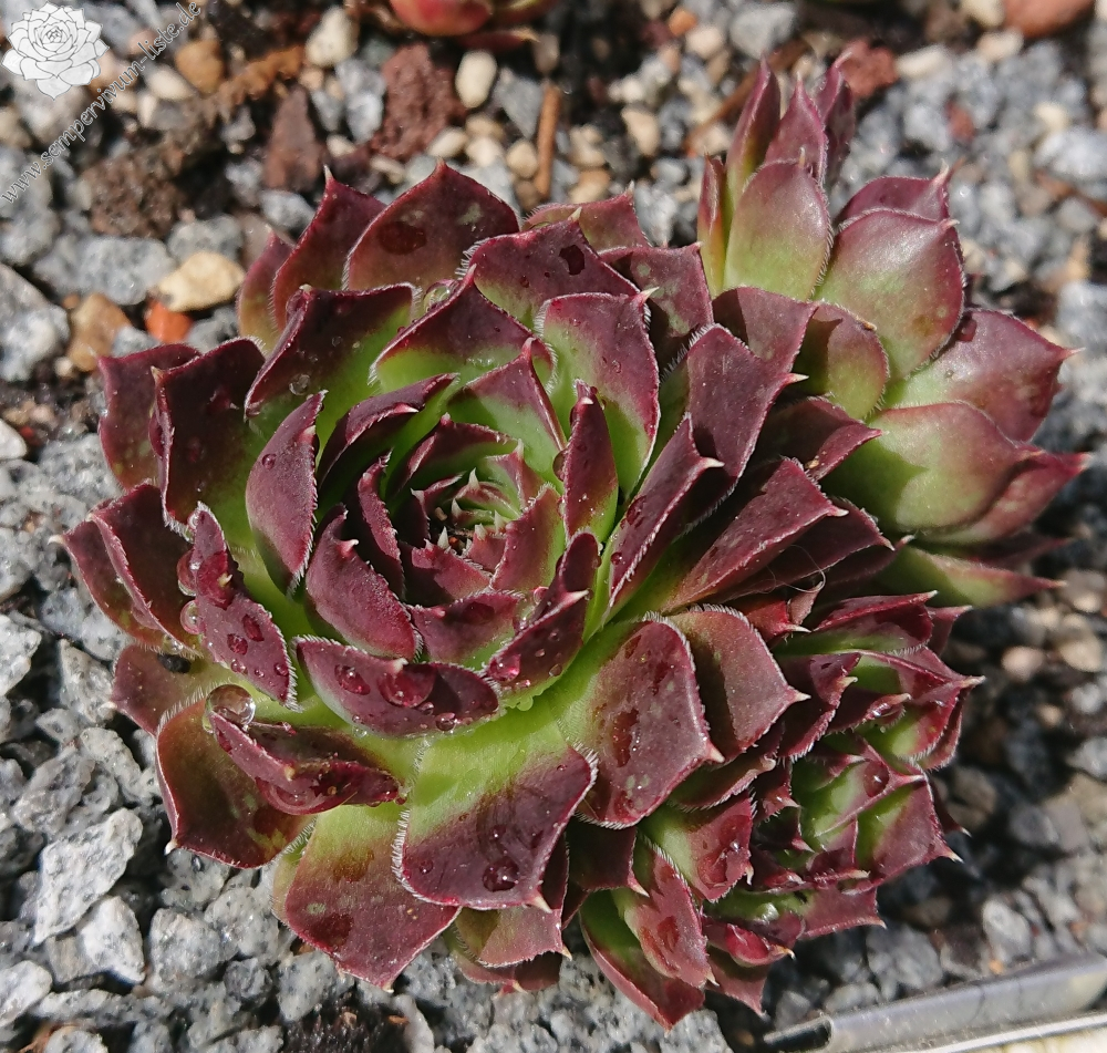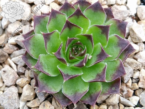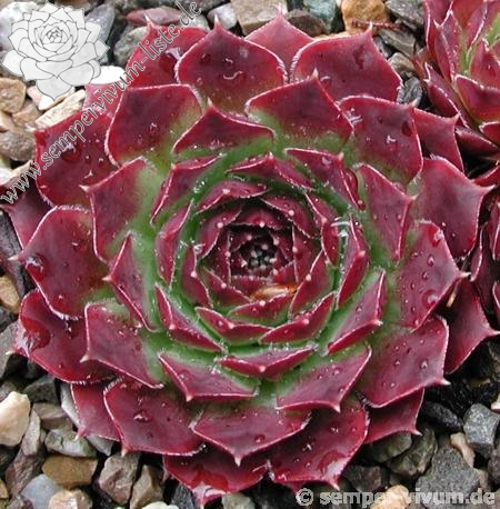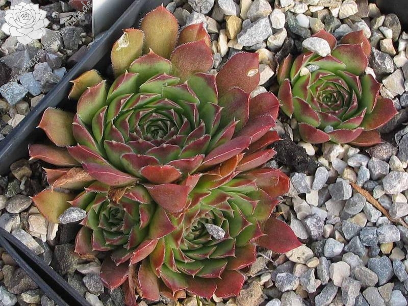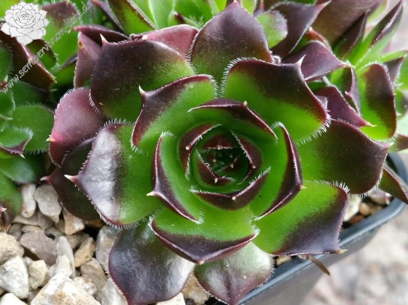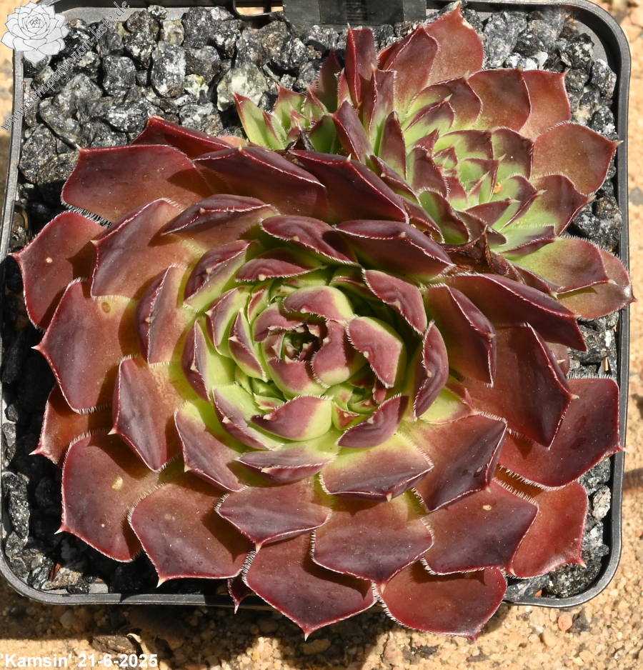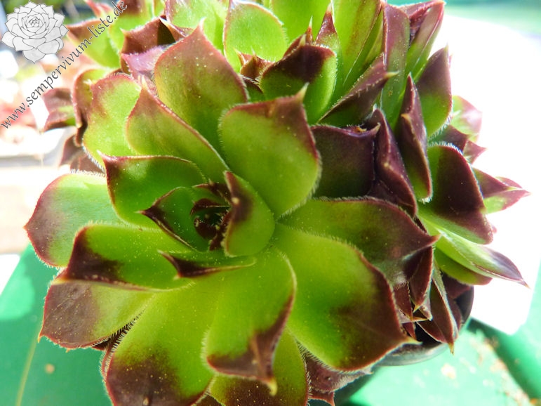 Eine neue Hybride aus Deutschland mit ca. 5 cm großen Rosetten. Die Spitzen sind breit himbeerrot gezeichnet.