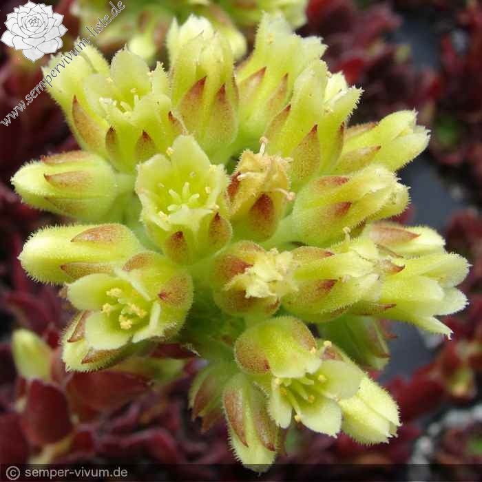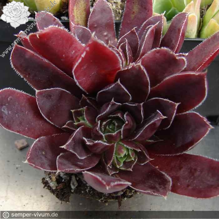 Die dunkelste Färbung zeigen die drei bis vier Zentimeter großen Rosetten ab Oktober. Aber auch schon Ende Juli bis August ein auberginefarbener Vorgeschmack. Ein Sämling und zugleich eine kleinere Ausgabe von 'Schwarzer Peter', wobei wir uns auch hier seit 10 Jahren um ausreichend Nachwuchs kümmern.
