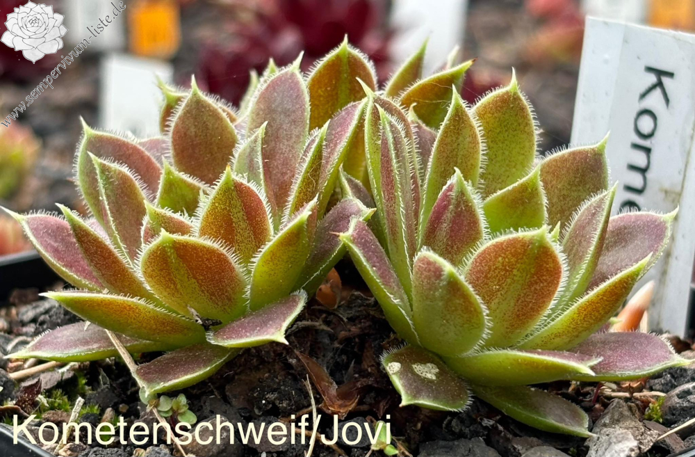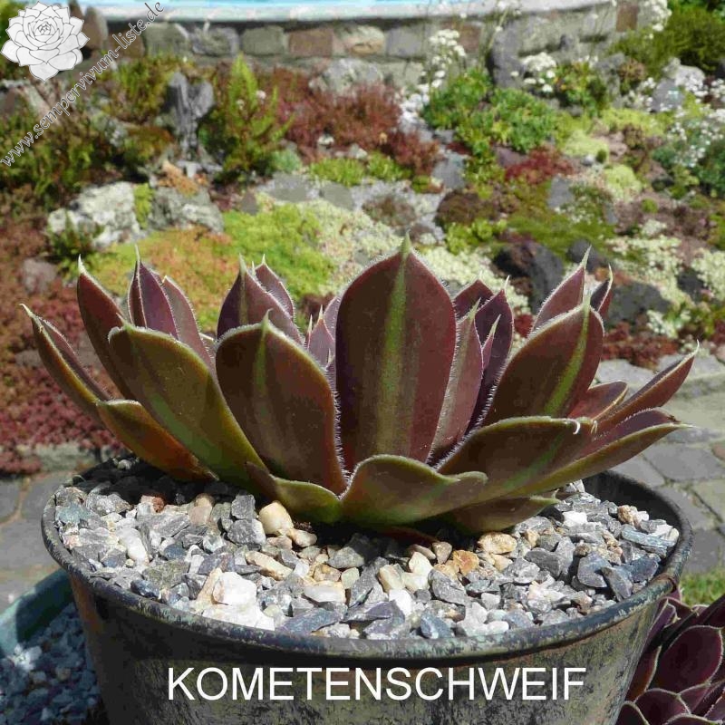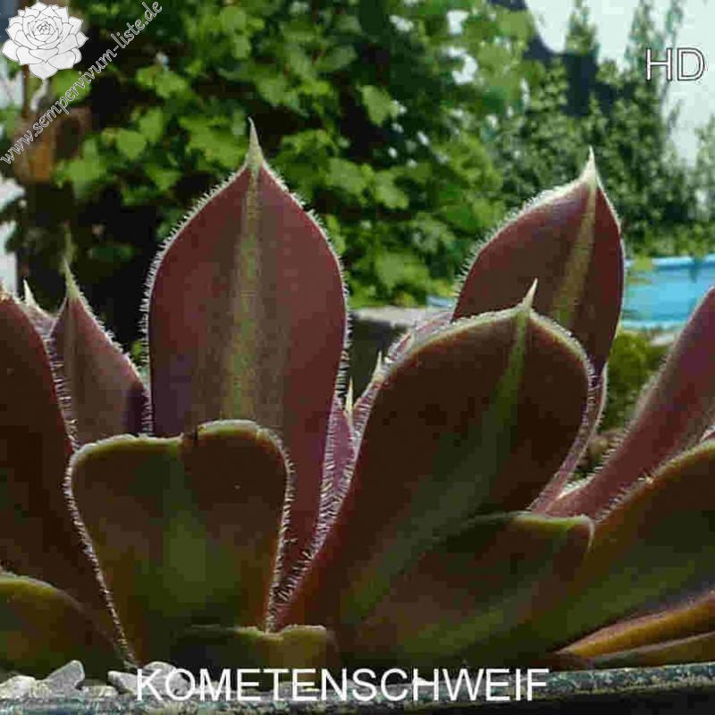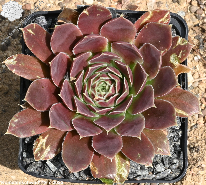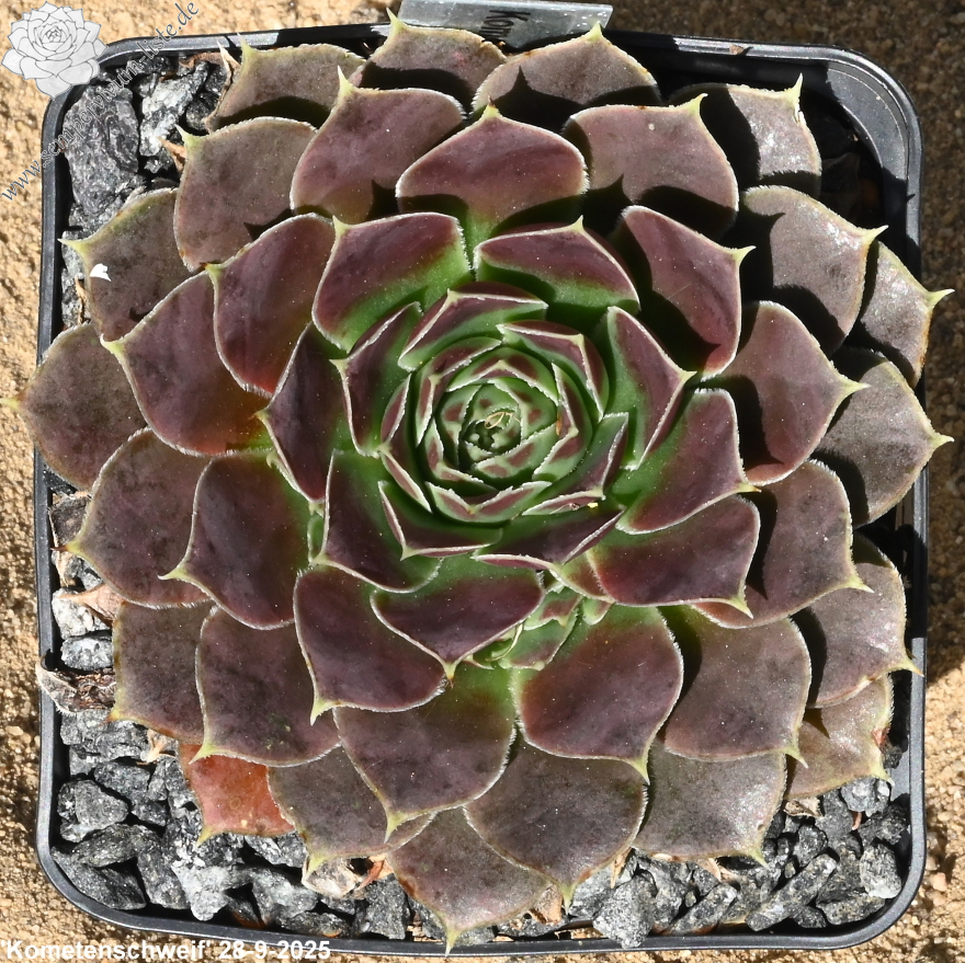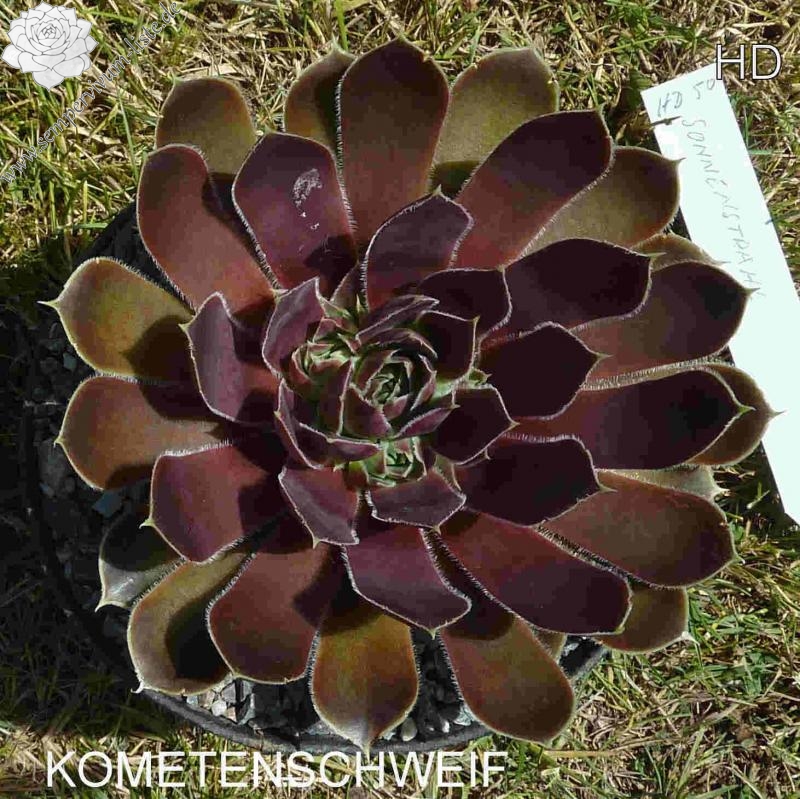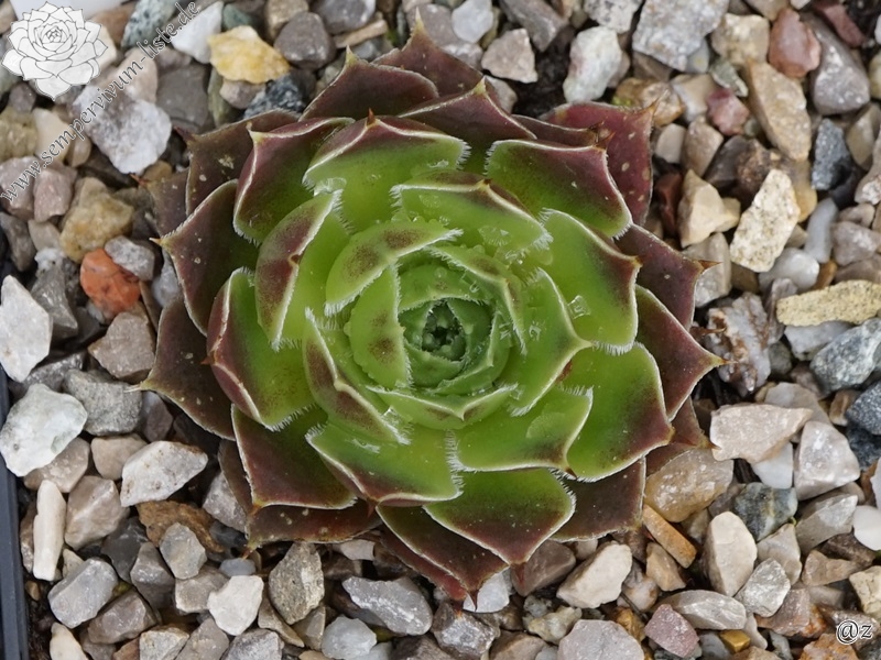Rosetten bis 12 cm, Zufallssämling, Blätter linealisch, lang bespitzt, Mischtöne weinrot - gelbbraun, an der Blattunterseite gelbgrüner Längsstreifen, der sich bis zum Herbst hält, besonders auffallend bei erhöhtem Stand, Blattränder bewimpert