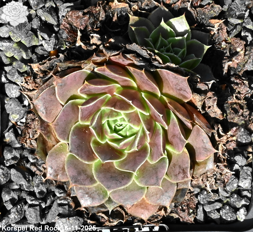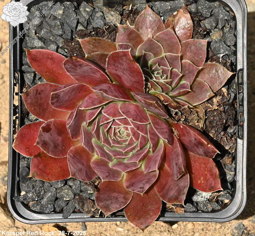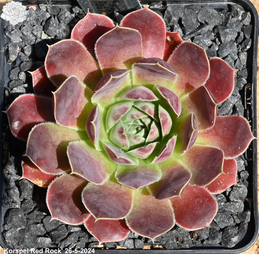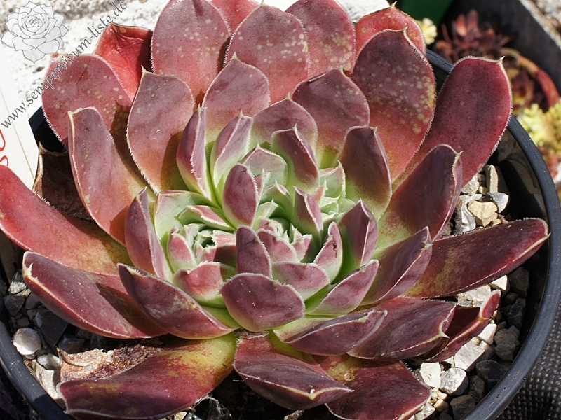 Rosetten bis 5 cm, Blätter lanzettlich, lang bespitzt, verkehrspurpur später zu oxidrot wechselnd, Basis hellgrün