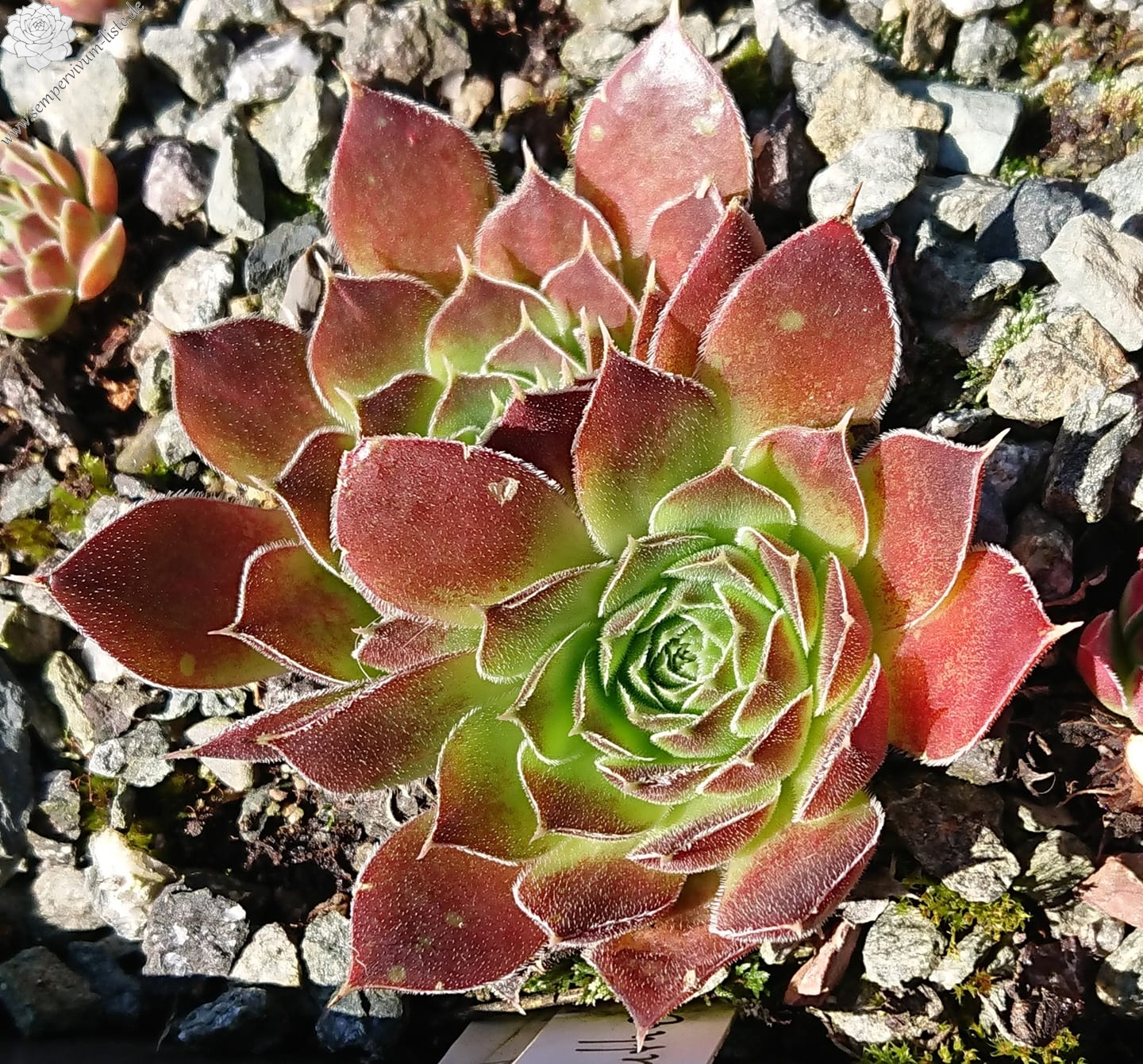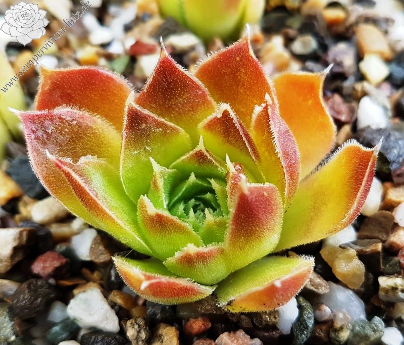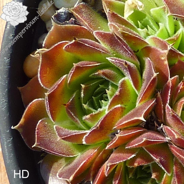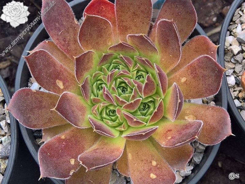 kleine Rosetten, Blätter keilförmig, kurz bespitzt, samtige Substanz, Herz hellgrün, Spitzen braun - rot, Ränder bewimpert