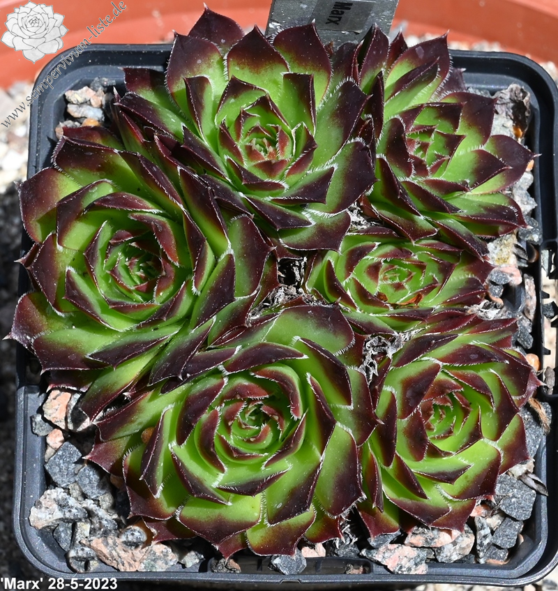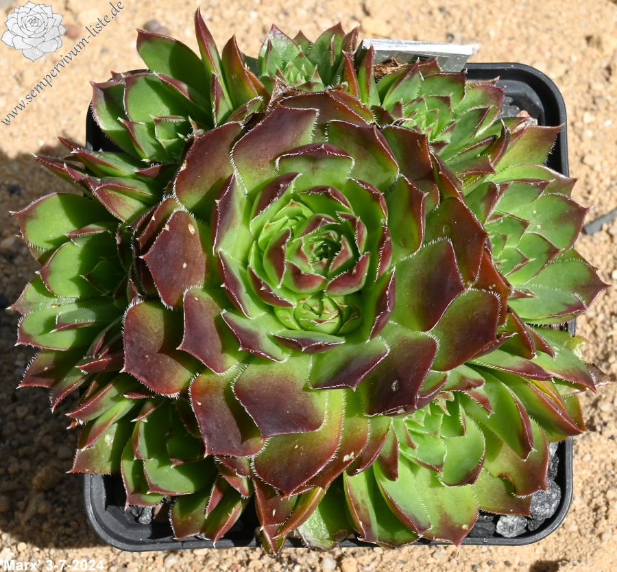 Der angebotene Donarsbart formt mittelgroße Rosetten in grüner Färbung. Die Blattspitzen heben sich, durch die dunkelbraune Tönung, deutlich ab. Hier kann man nicht mit Sicherheit sagen, ob es sich um eine offiziell benannte Auslese handelt. Sie stammt aus der gleichnamigen Gärtnerei und es könnte auch lediglich die Angabe der Herkunft aus einer Sammlerliste sein.