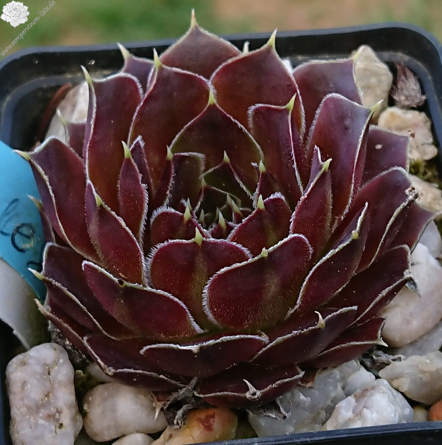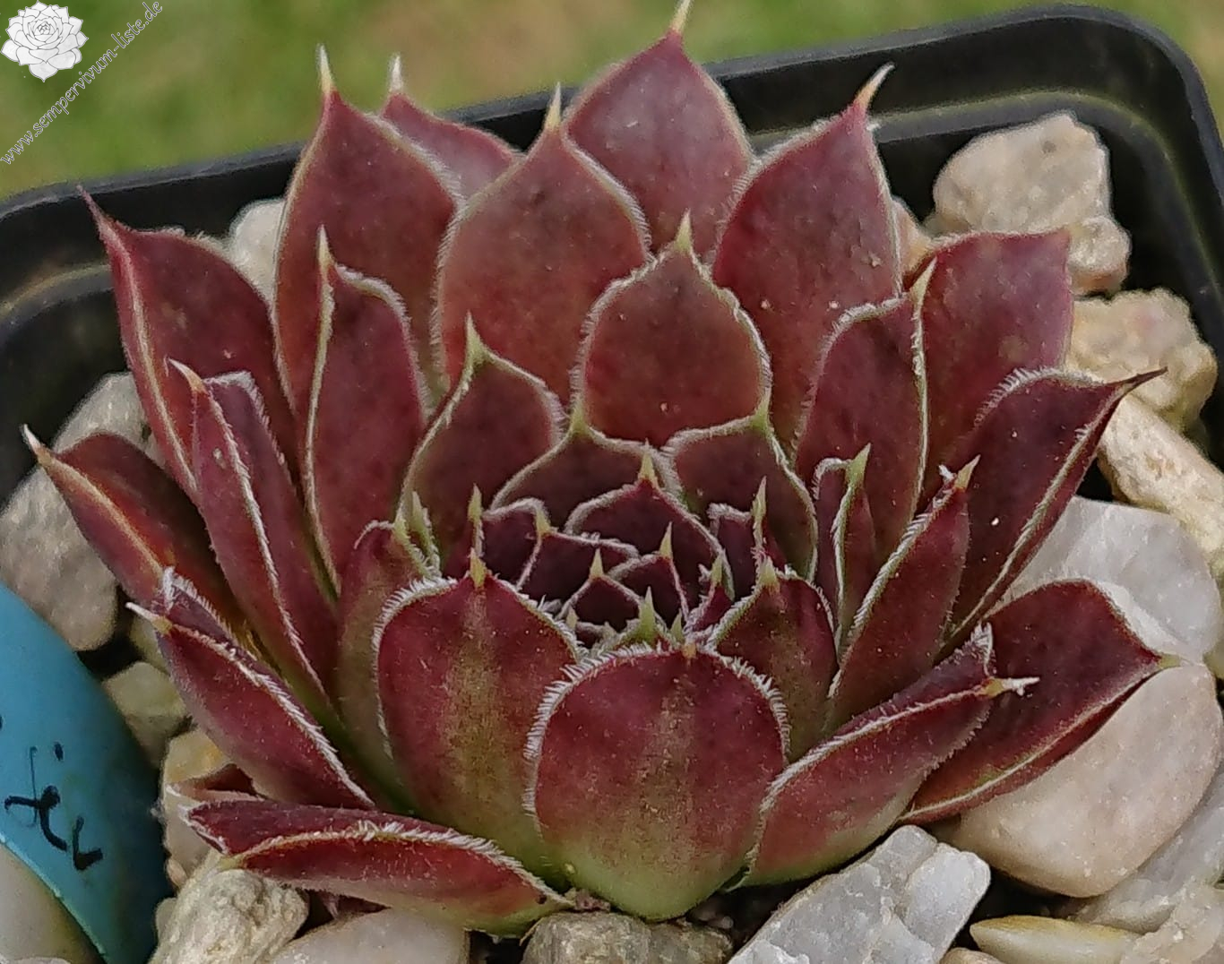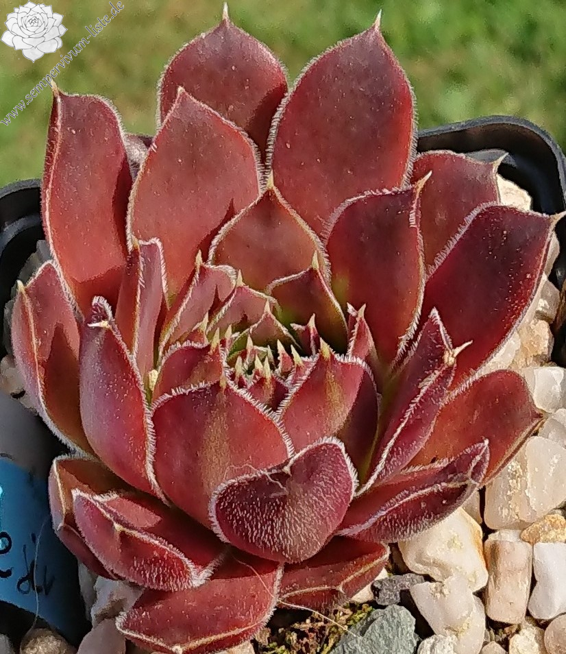 kleine Rosetten, Blätter eiförmig, kurz bespitzt, rotviolett - purpurrot, Blattränder bewimpert