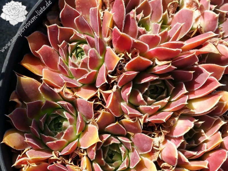 Rosetten bis 6 cm, Blätter lanzettlich, lang gespitzt, weinrot, Blattränder hell bewimpert