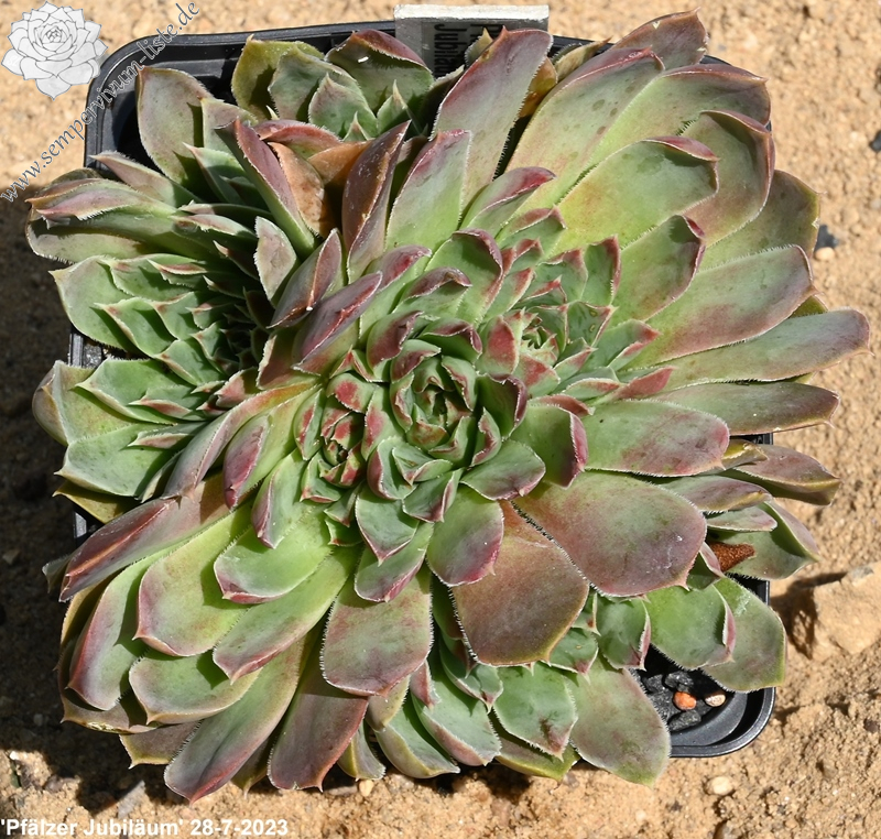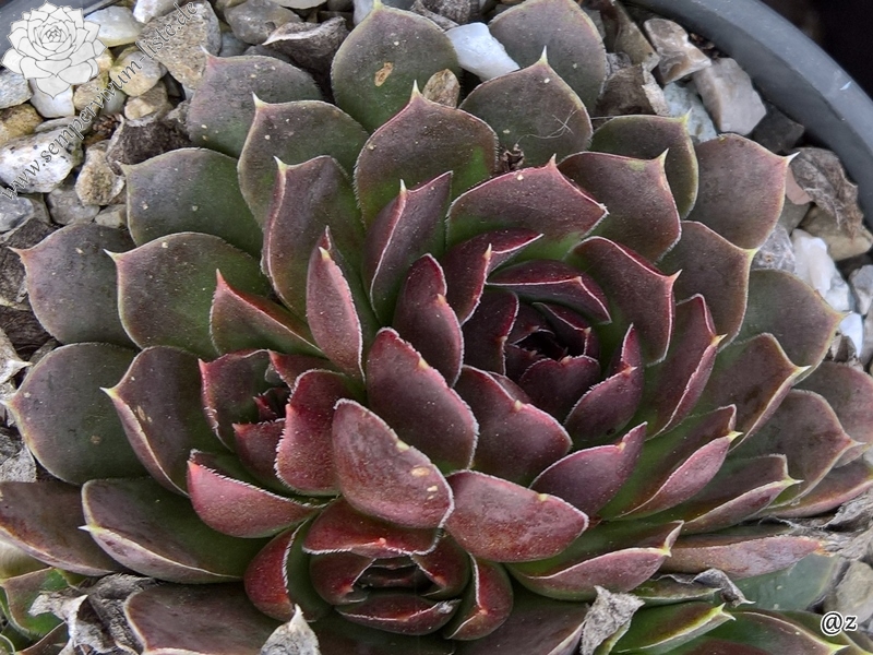 Rosetten bis 5 cm, Blätter rundlich, kurz bespitzt, Basis hellolivgrün, obere Blattdrittel braunrot - oxidrot