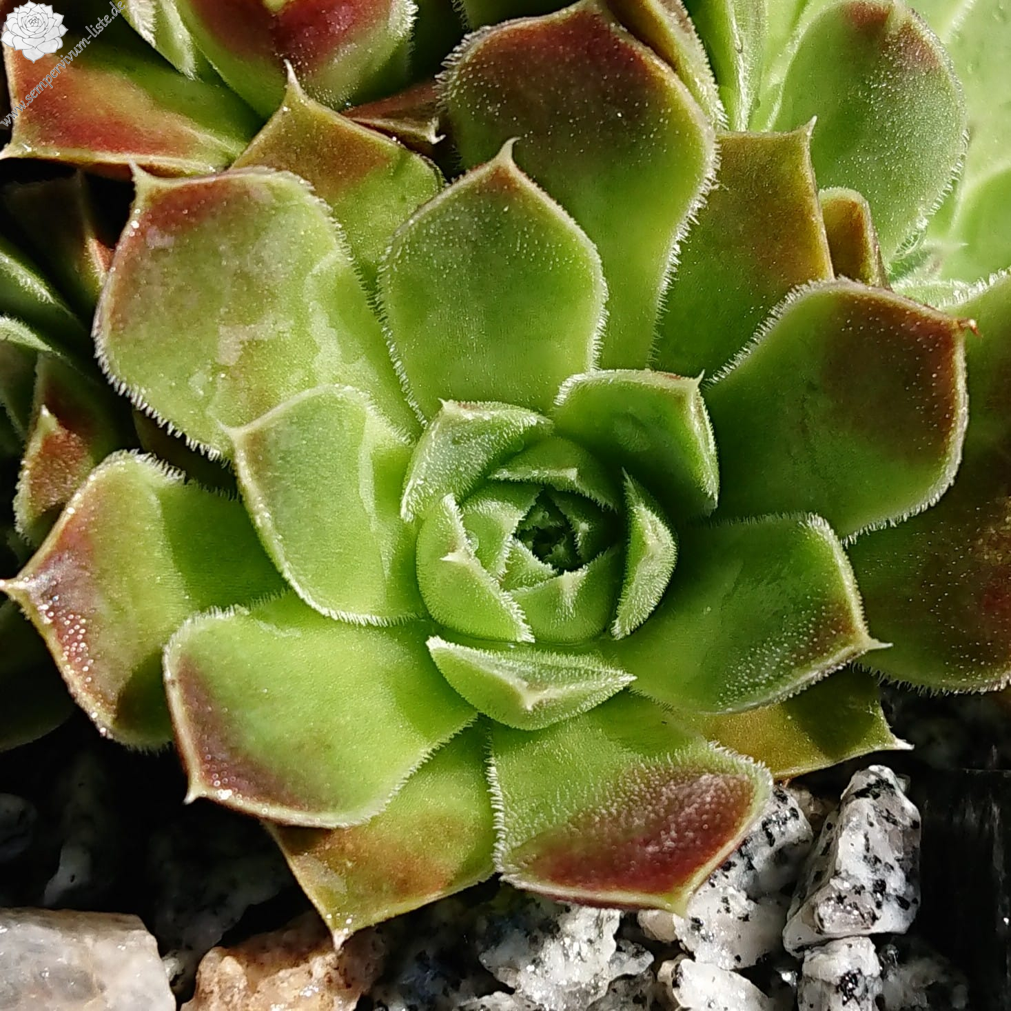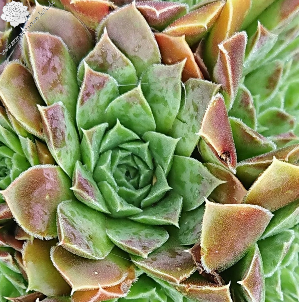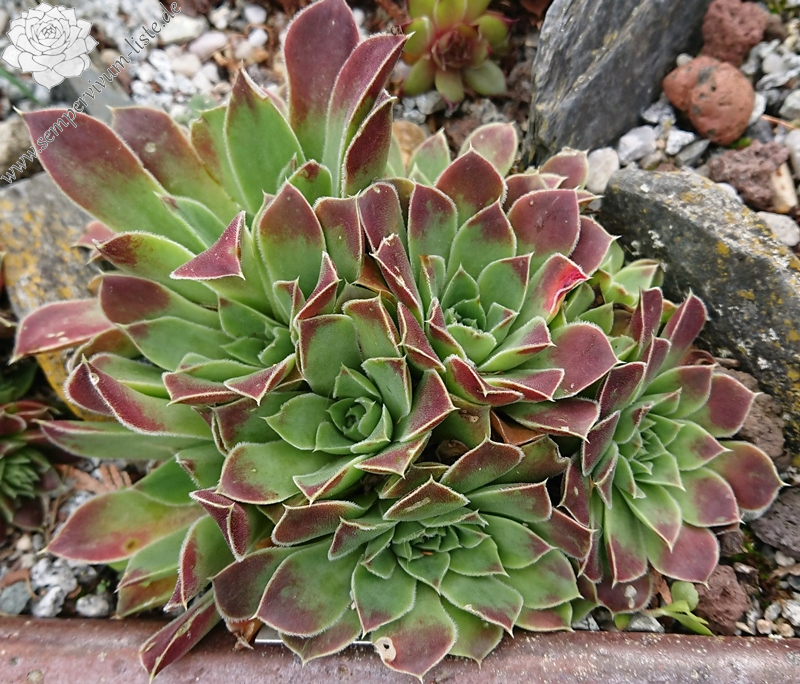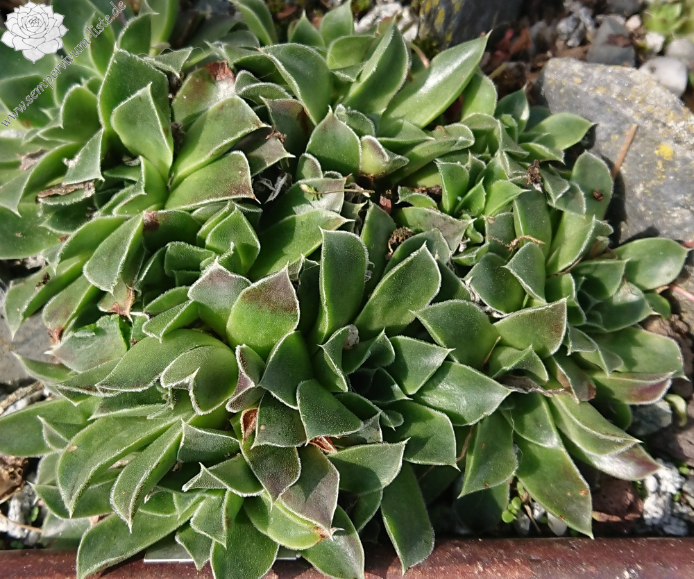 Rosetten bis 7 cm, Blätter oval, kurz bespitzt, resedagrün, teilweise rötlich überhaucht