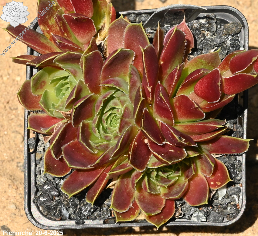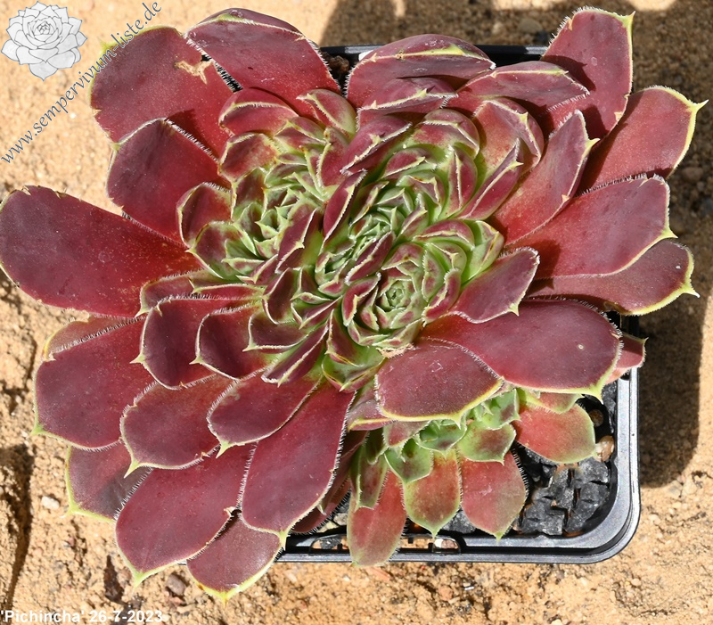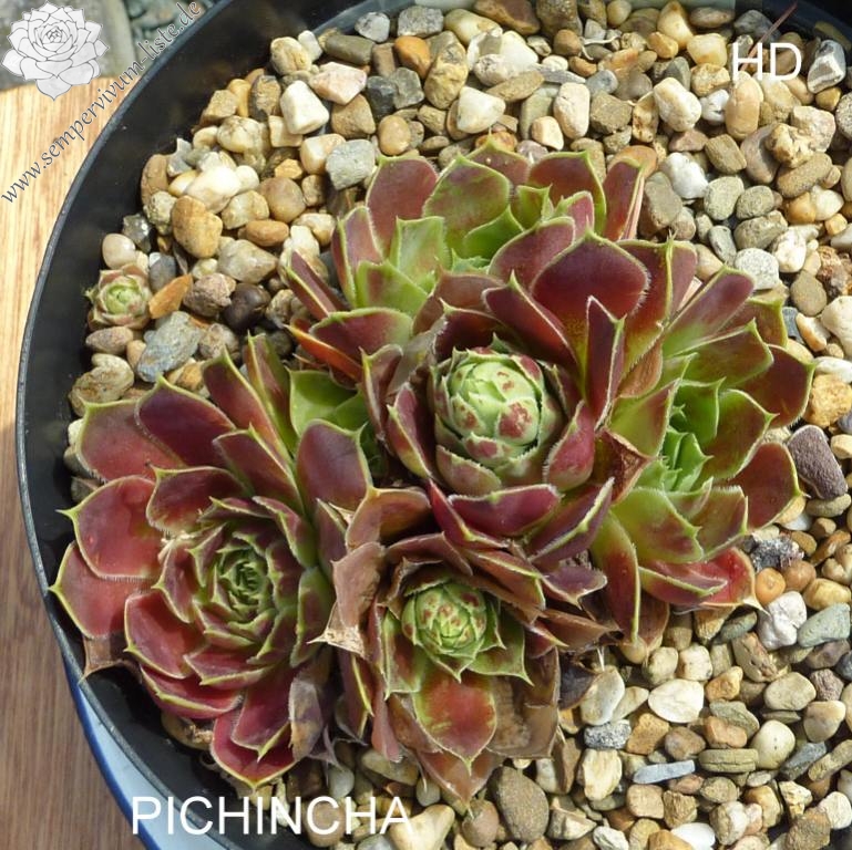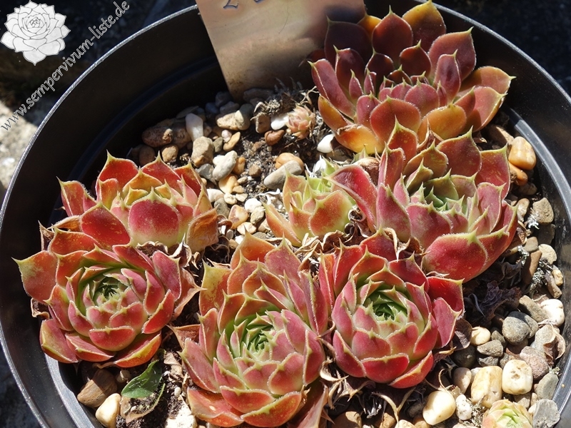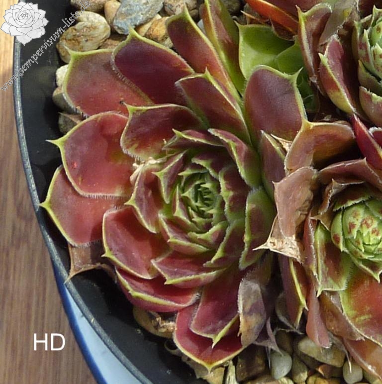 Rosetten bis 5 cm, Blätter oval, kurz bespitzt, Basis grün, Rest weinrot, Blattränder helles grün