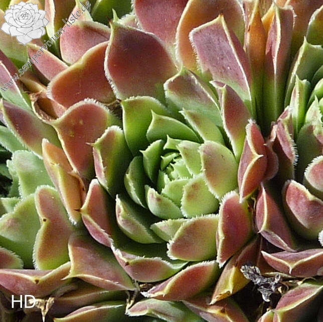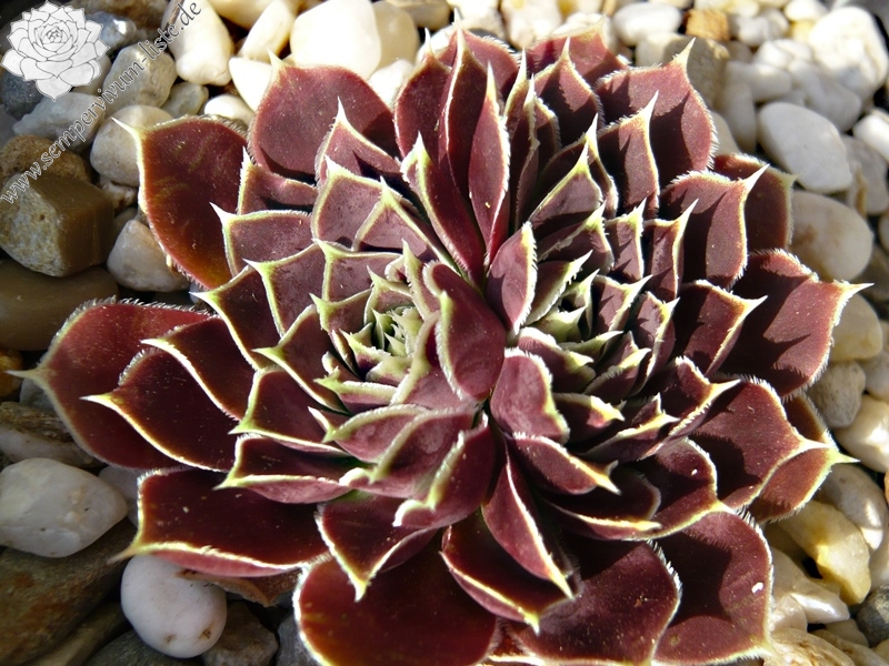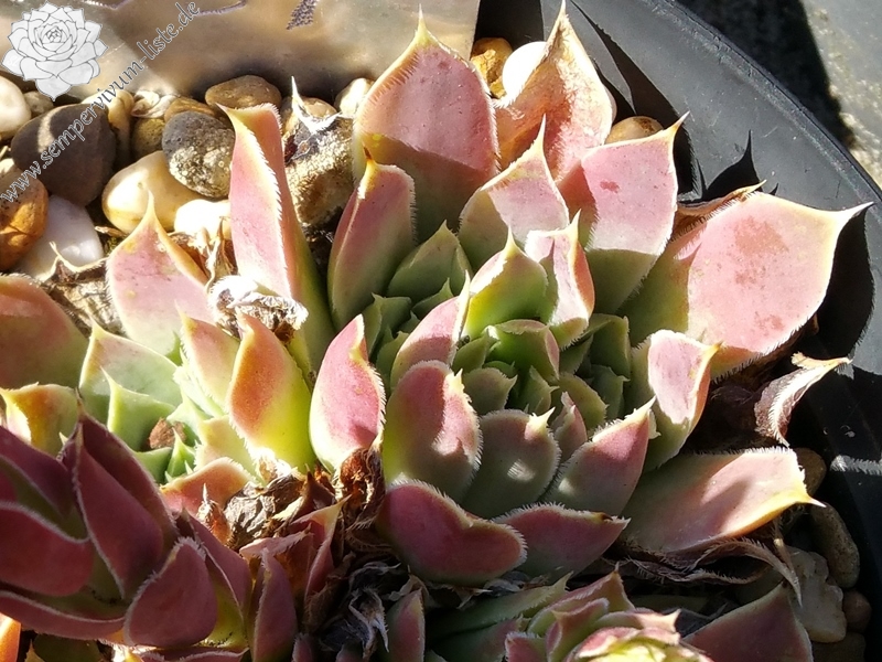 Rosetten bis 5 cm, Blätter lanzettlich, lang bespitzt, Herz hellgrün, Rest altrosa, Blattränder hell