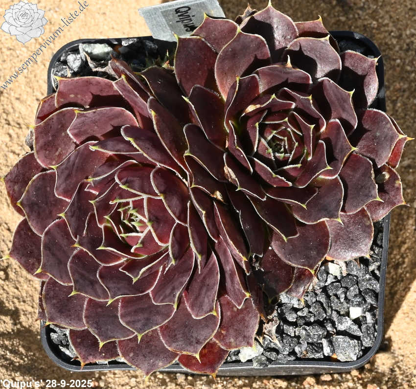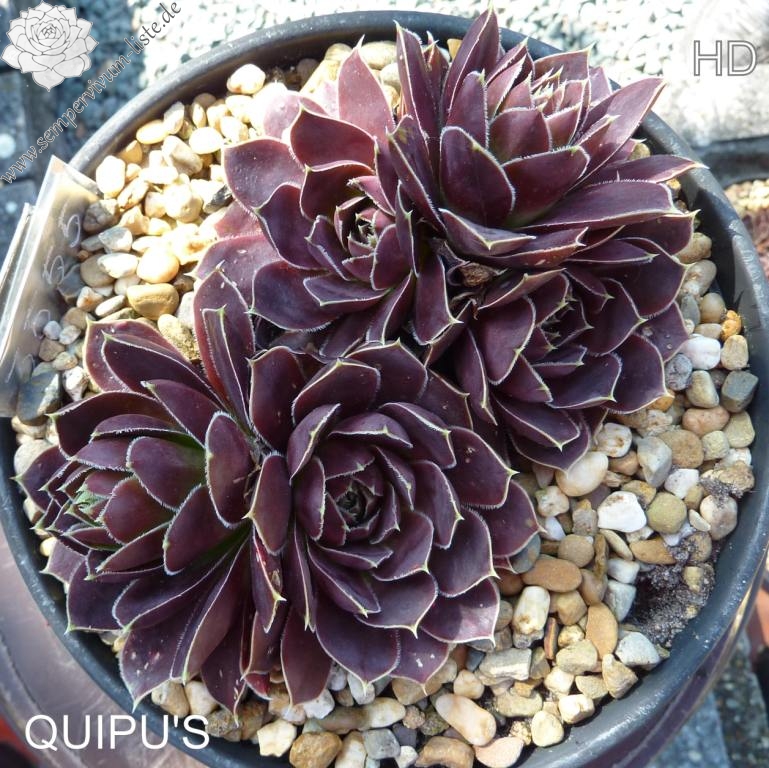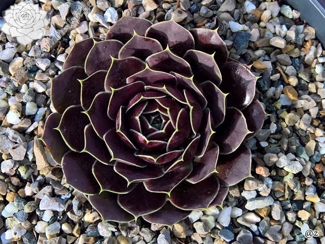 Rosetten bis 8 cm, Blätter breit spatelig, kurz bespitzt, dunkles Rotlila, Blattränder hell, bewimpert