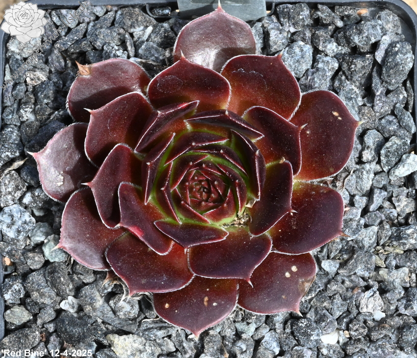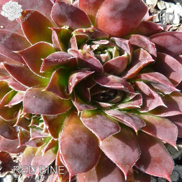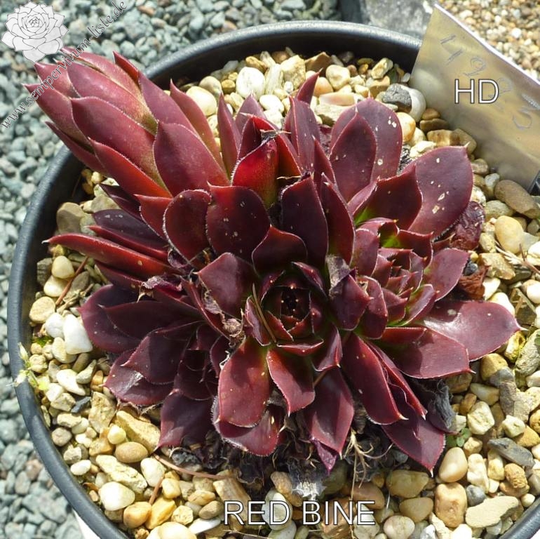 offene Rosetten bis 12 cm, Blätter keilförmig, kurz bespitzt, Basis helles grün, Rest rot - braun, später im Jahr dunkler werdend, Blättränder bewimpert, Zufallssämling, Aussaat 2000, benannt nach der Tochter des Züchters, Frau Bine (Sabine) Schwaldt.