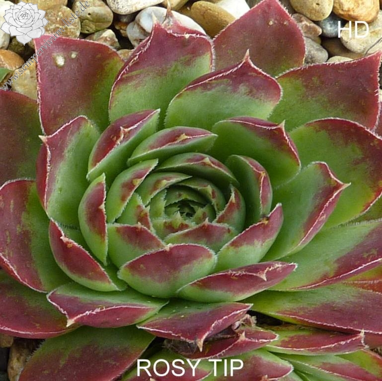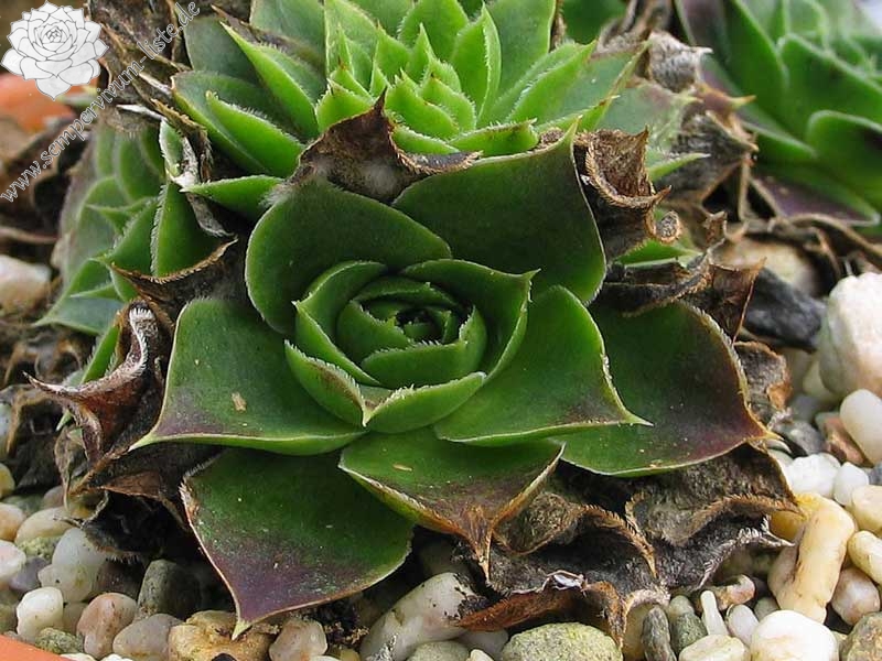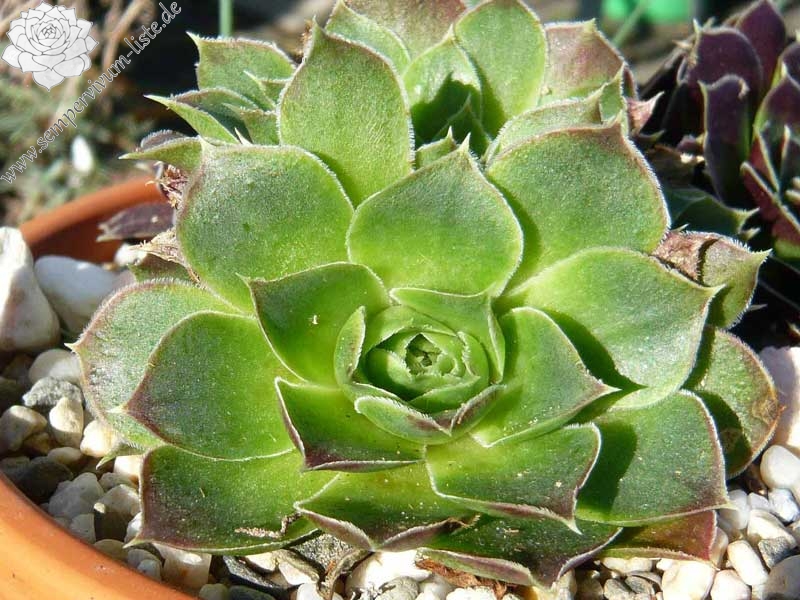 Rosetten bis 6 cm, Blätter breit lanzettlich, lang bespitzt, Basis hellgrün, obere Blattdrittel braunrot - rotlila , Blattränder bewimpert