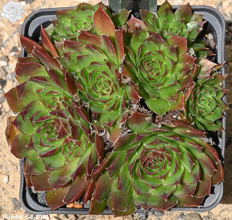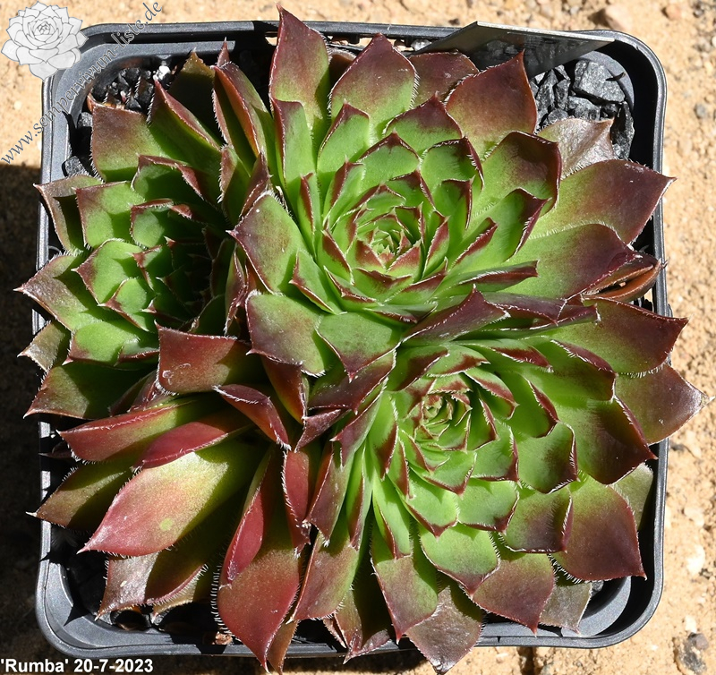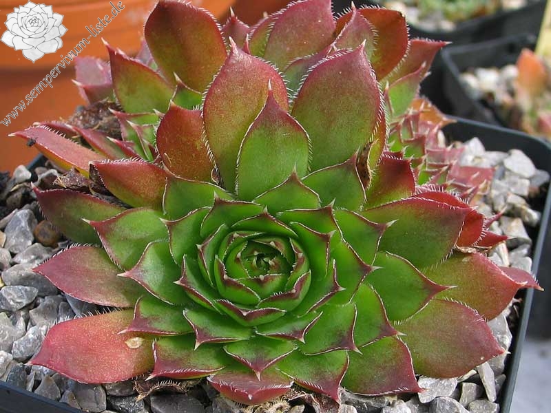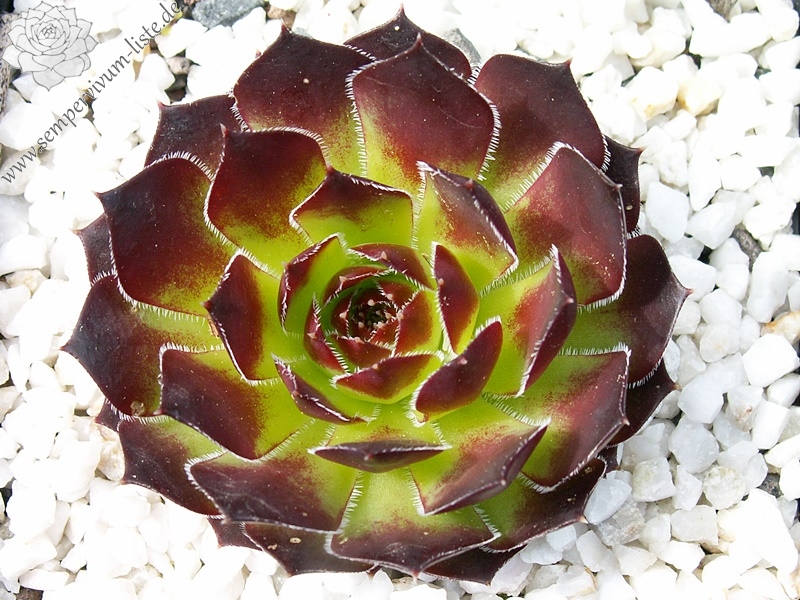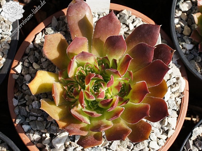 Rosetten bis 7 cm, Blätter lanzettlich, lang bespitzt, helles gelb - grün mit kräftig dunkel rot - kastanienbraunen Spitzen, Blättränder silbern bewimpert, Zufallssämling, Aussaat 1999